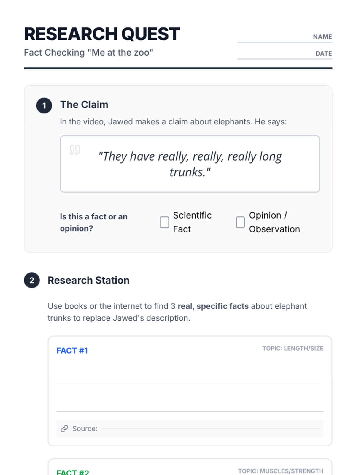 A media literacy and research skills lesson for grades 3-5 where students verify claims from the first YouTube video, "Me at the zoo," using secondary sources.