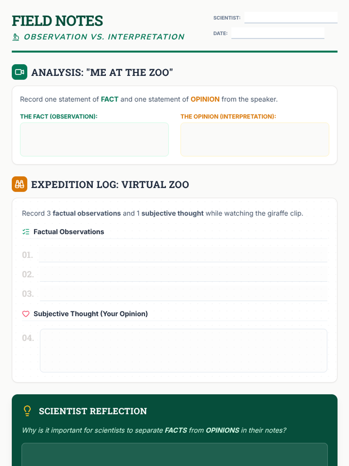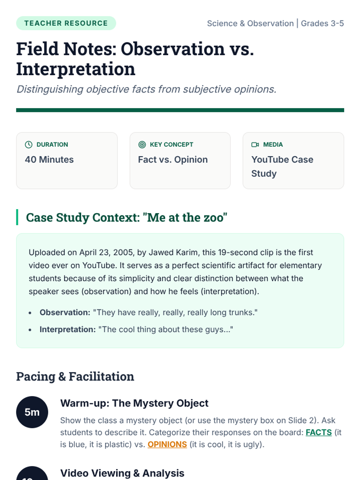 A science and observation lesson for elementary students focused on distinguishing between objective facts (observations) and subjective opinions (interpretations) using the first-ever YouTube video as a case study.