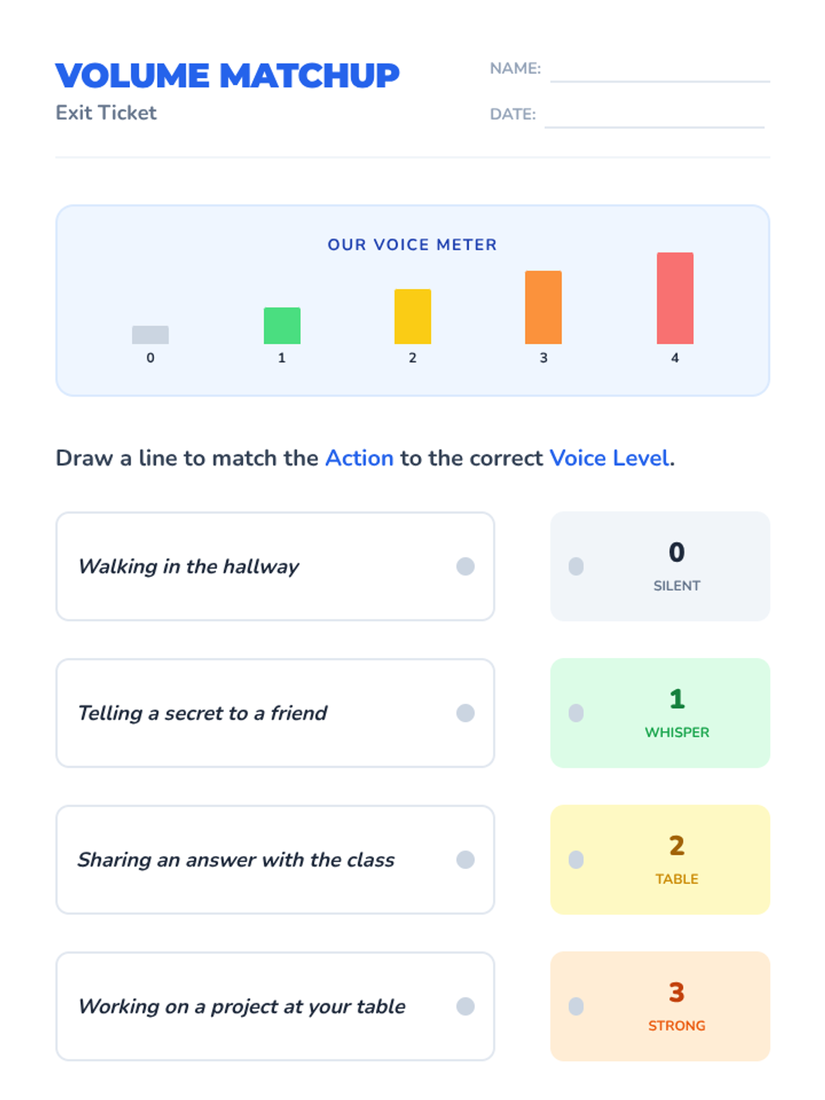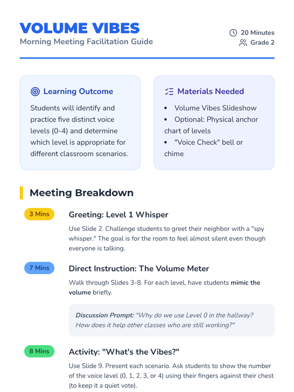 A 20-minute morning meeting designed to help 2nd graders identify and practice appropriate classroom voice levels through interactive discussion and visual aids.