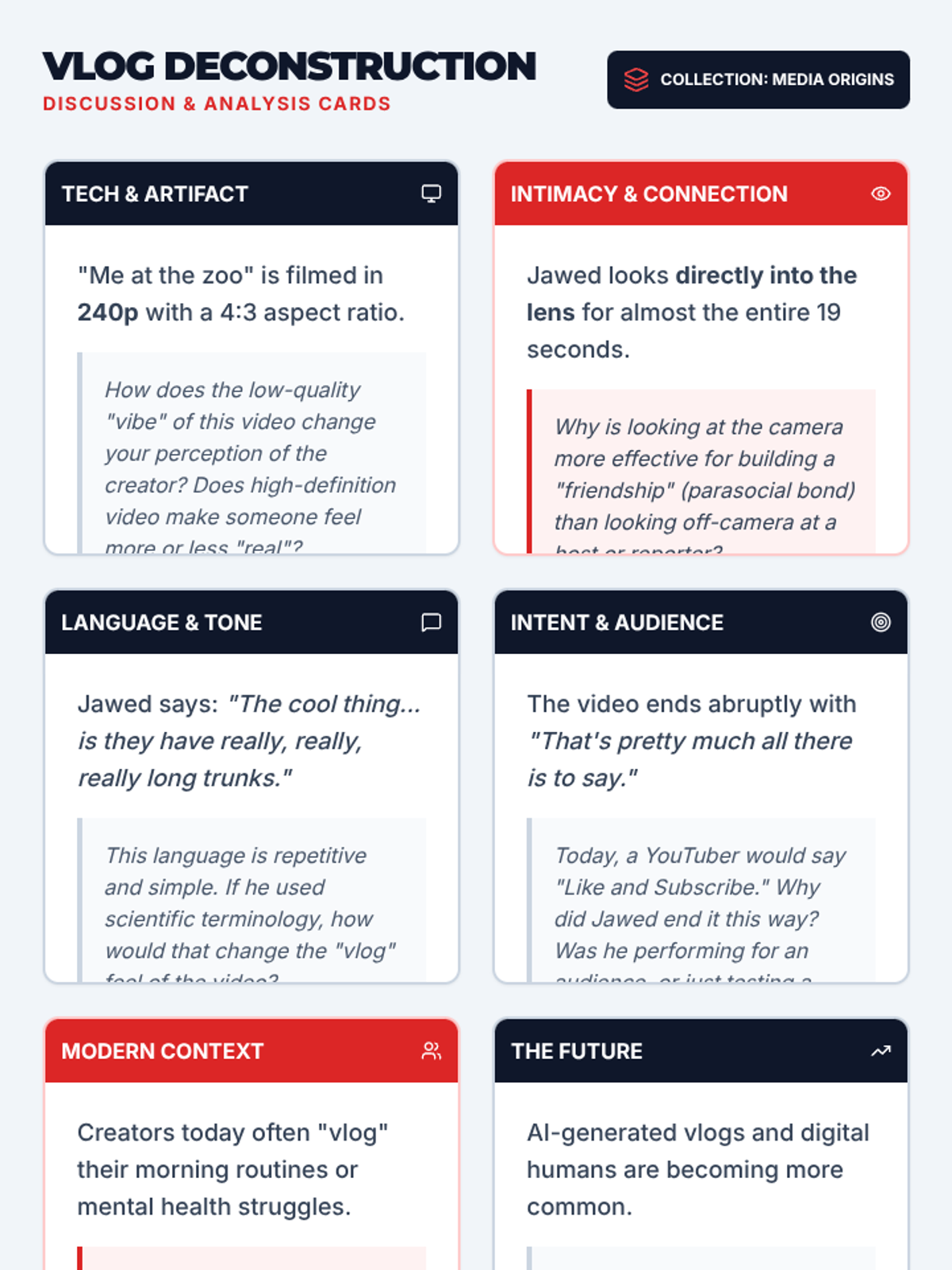 A lesson analyzing 'Me at the zoo', the first YouTube video, to understand the evolution of digital communication, authenticity vs. production, and user-generated content.