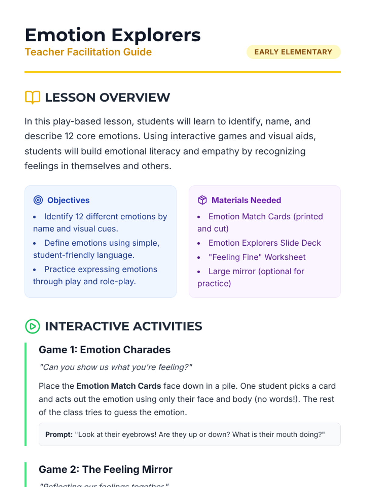 A play-based lesson designed to help young students identify and understand a wide range of emotions through interactive games and visual aids.