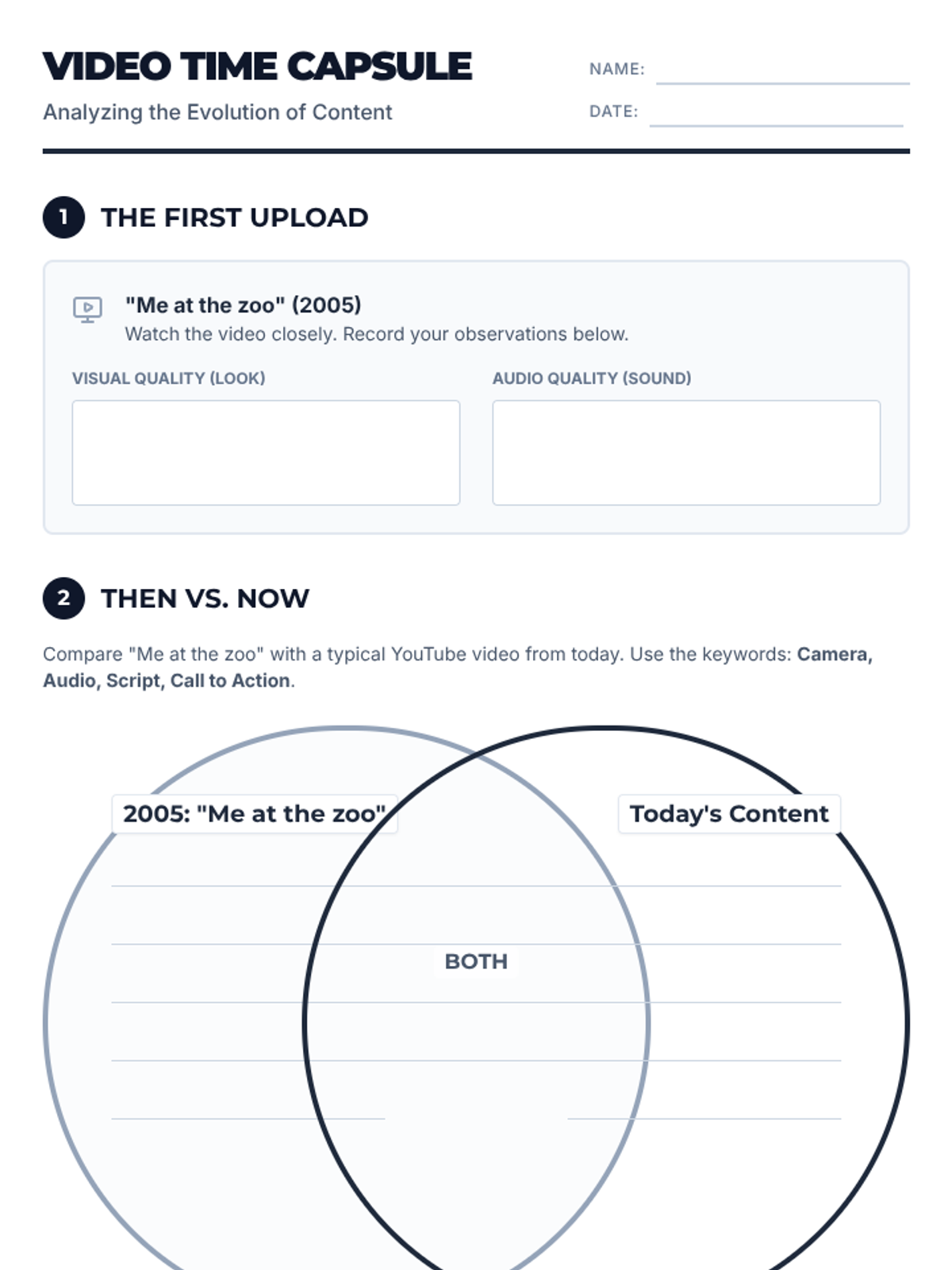 Students analyze the evolution of digital media by comparing the first-ever YouTube video, 'Me at the zoo,' with modern production standards, focusing on production quality, scripting, and the concept of user-generated content.