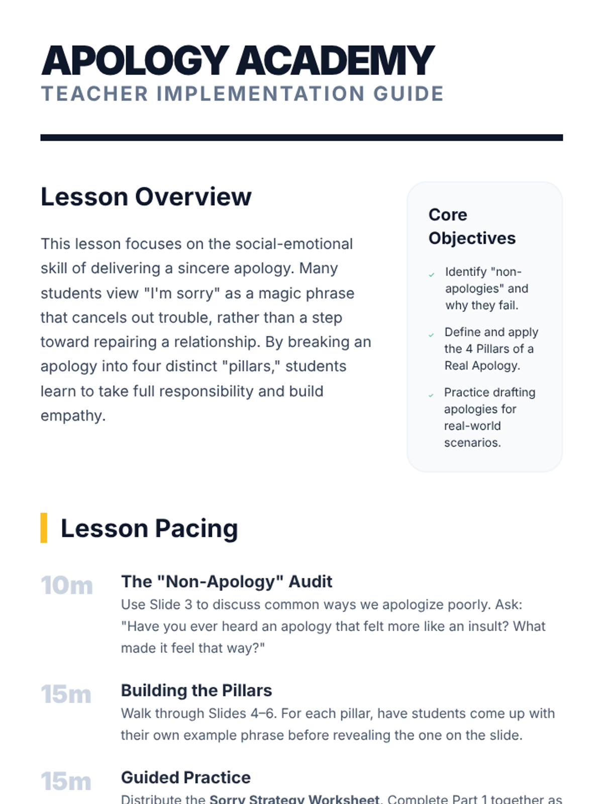 A lesson on the social-emotional skill of delivering a sincere and effective apology, focusing on the four pillars of a real apology.