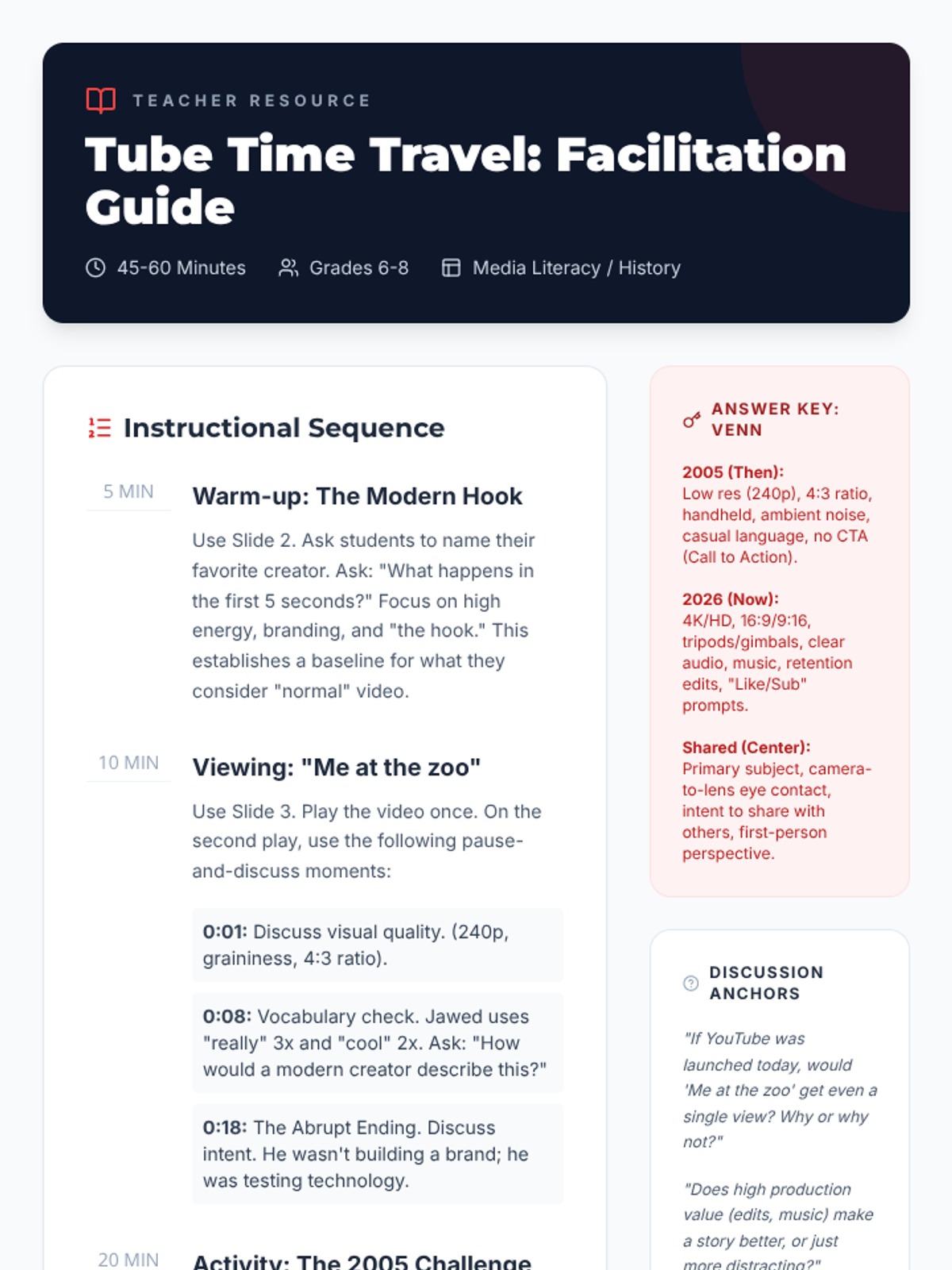 A lesson exploring the transformation of media through the history of YouTube, contrasting the simplicity of the first 'User-Generated Content' with modern, high-production digital storytelling. Students will analyze technical shifts and practice scripting for a simpler era.