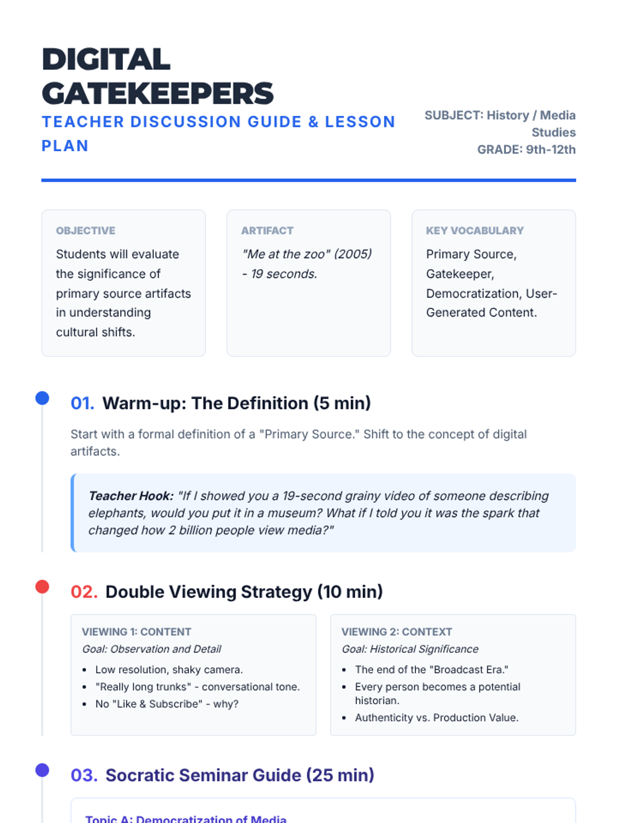 A high school history and social studies lesson exploring the birth of user-generated content and the democratization of media through the lens of the first YouTube video. Students analyze the 19-second artifact to understand how digital media shifted from professional gatekeepers to public participation.