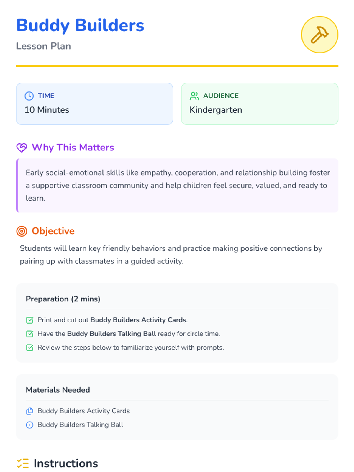 In this 10-minute kindergarten lesson, students will learn to build positive relationships with peers through a fun, interactive activity. This lesson is crucial for developing early social skills, empathy, and cooperation in young learners.
