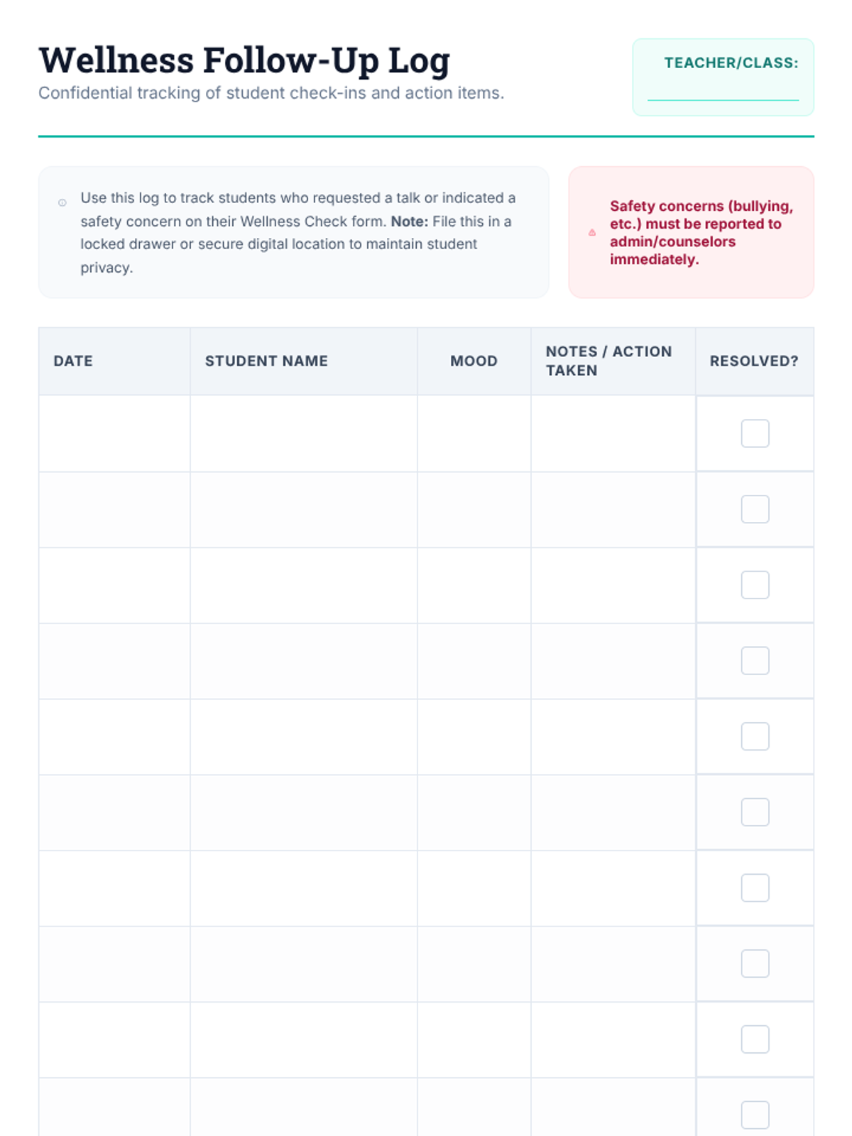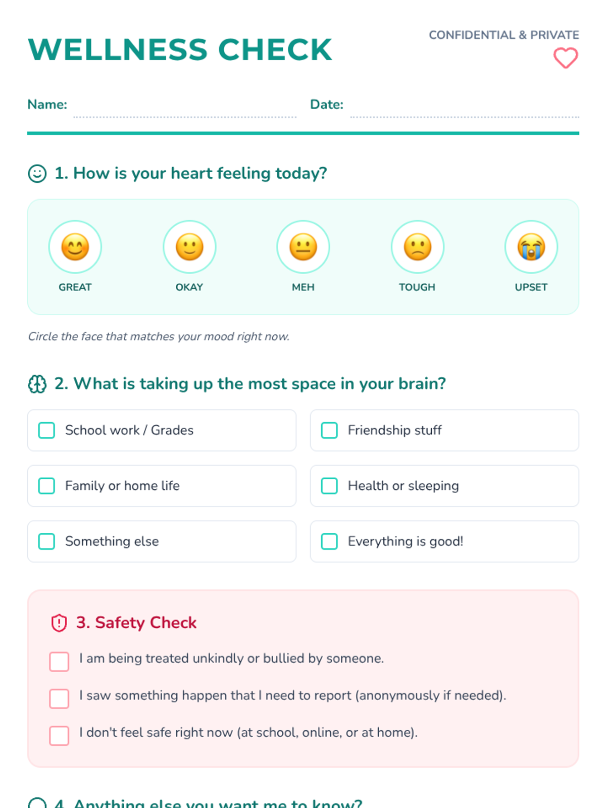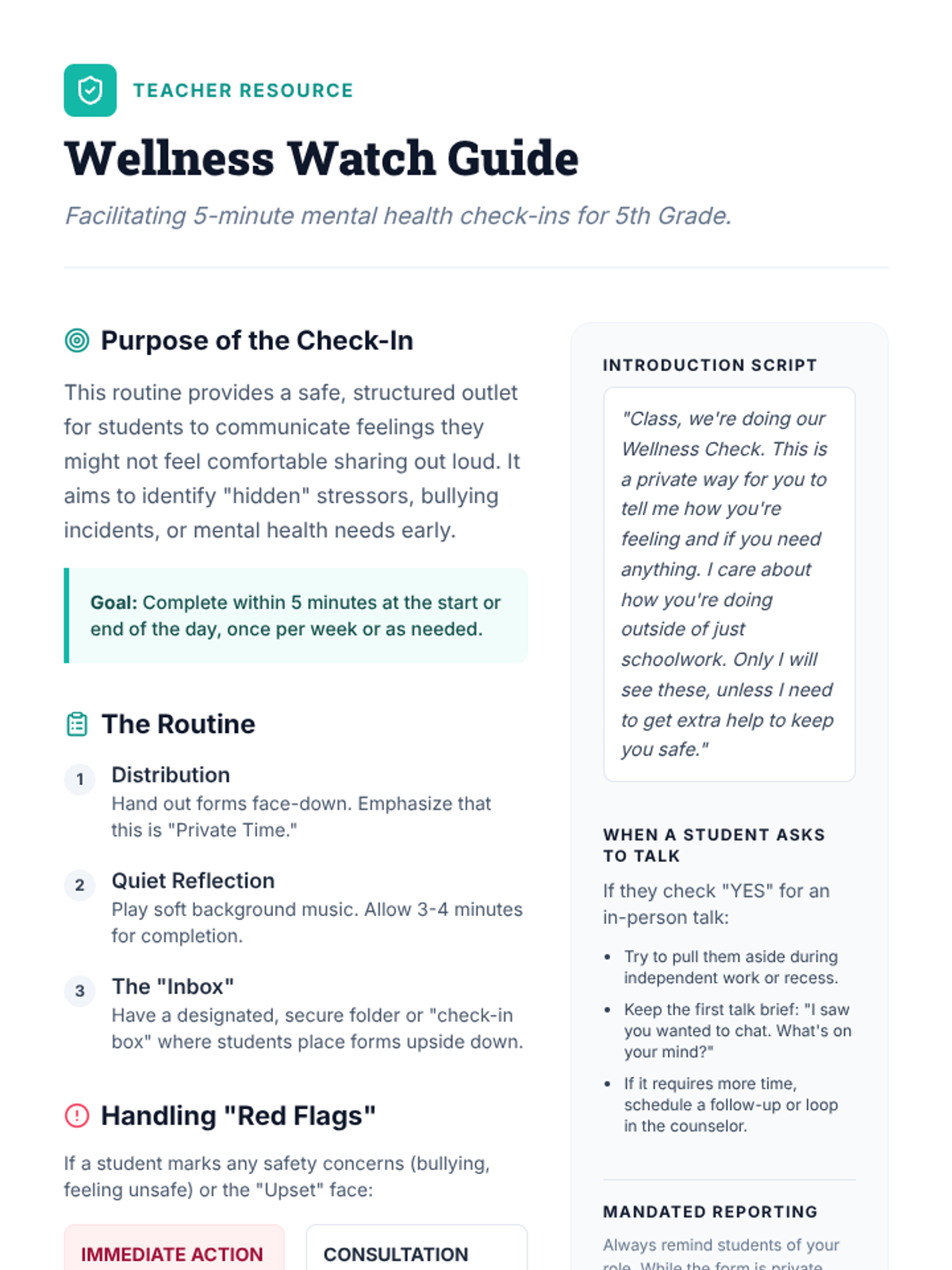 A quick and supportive 5-minute mental health check-in routine designed for 5th-grade students to express their feelings, report concerns like bullying, and seek support.