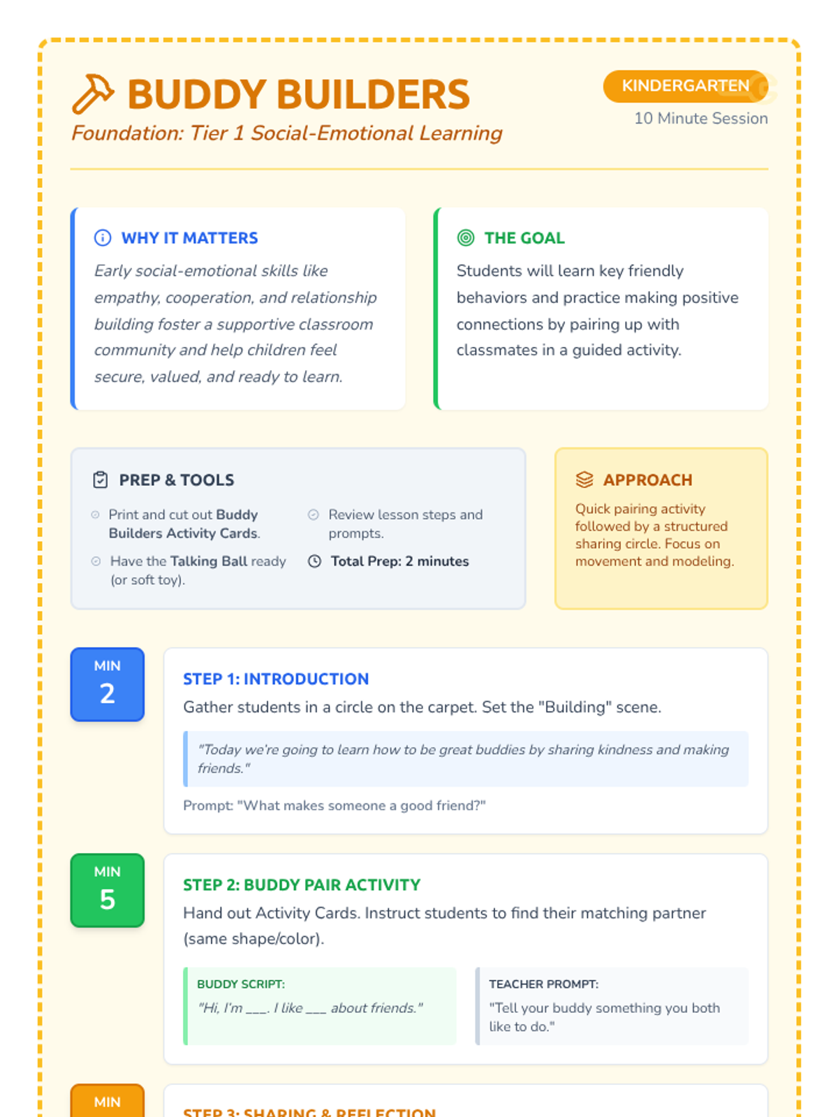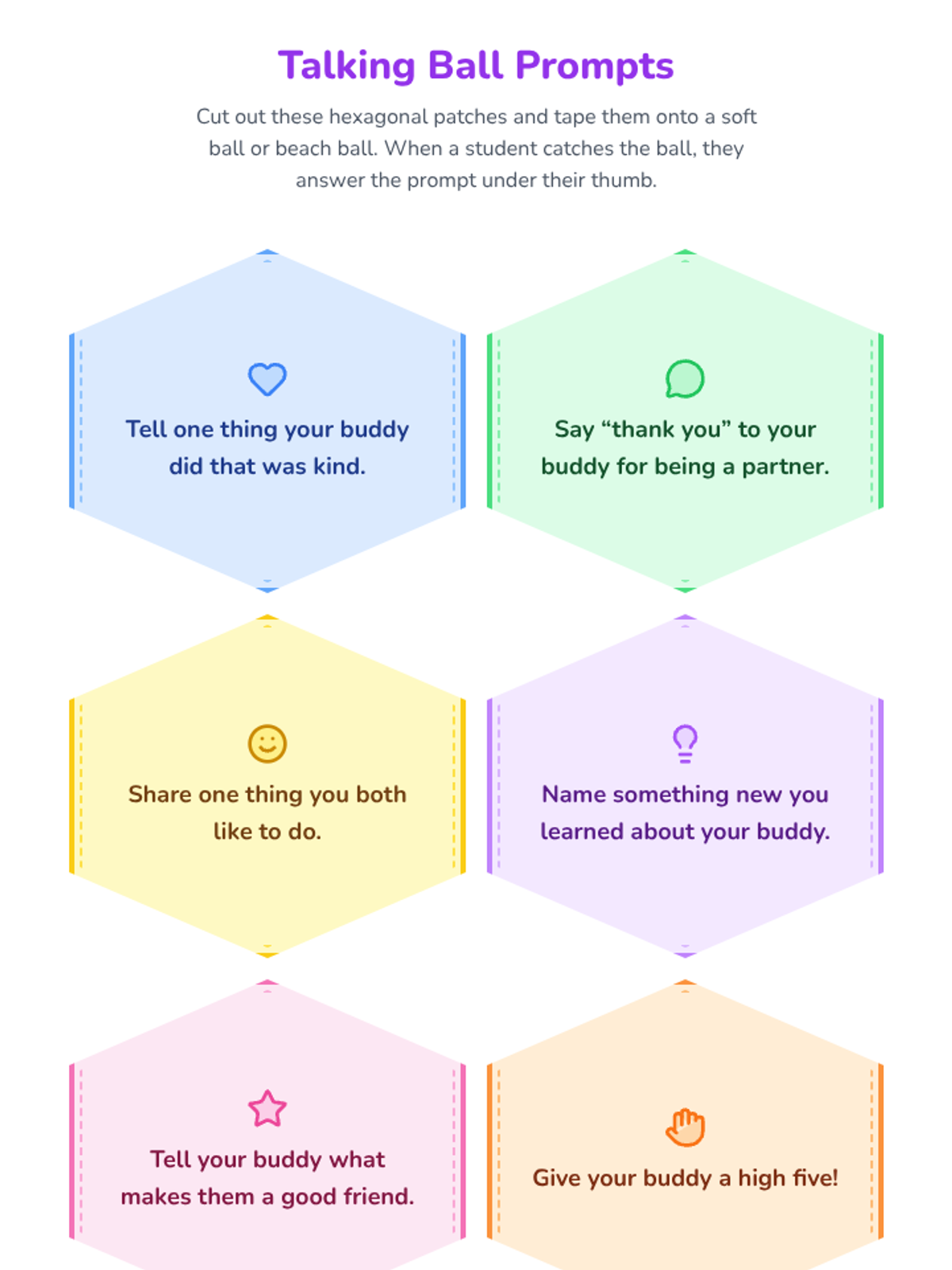 A quick 10-minute interactive lesson for kindergarteners to practice positive social interactions, empathy, and cooperation through guided pairing and sharing activities.