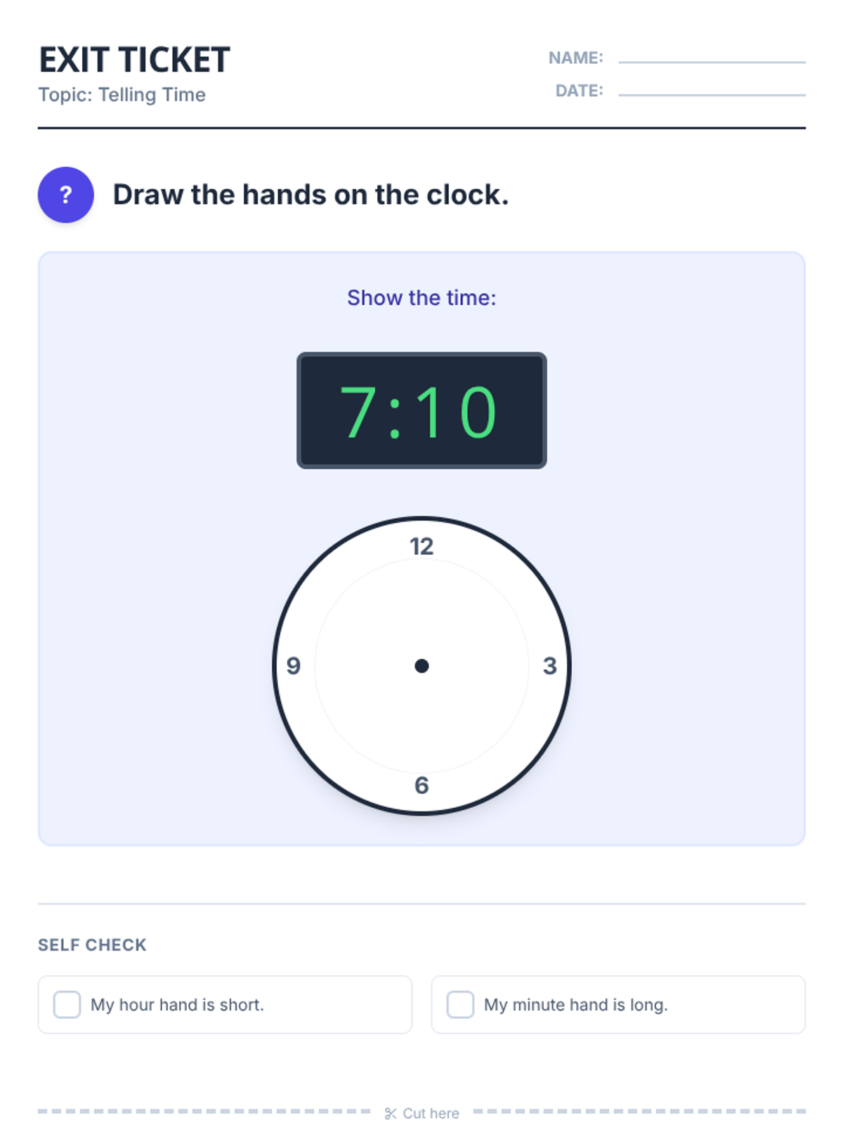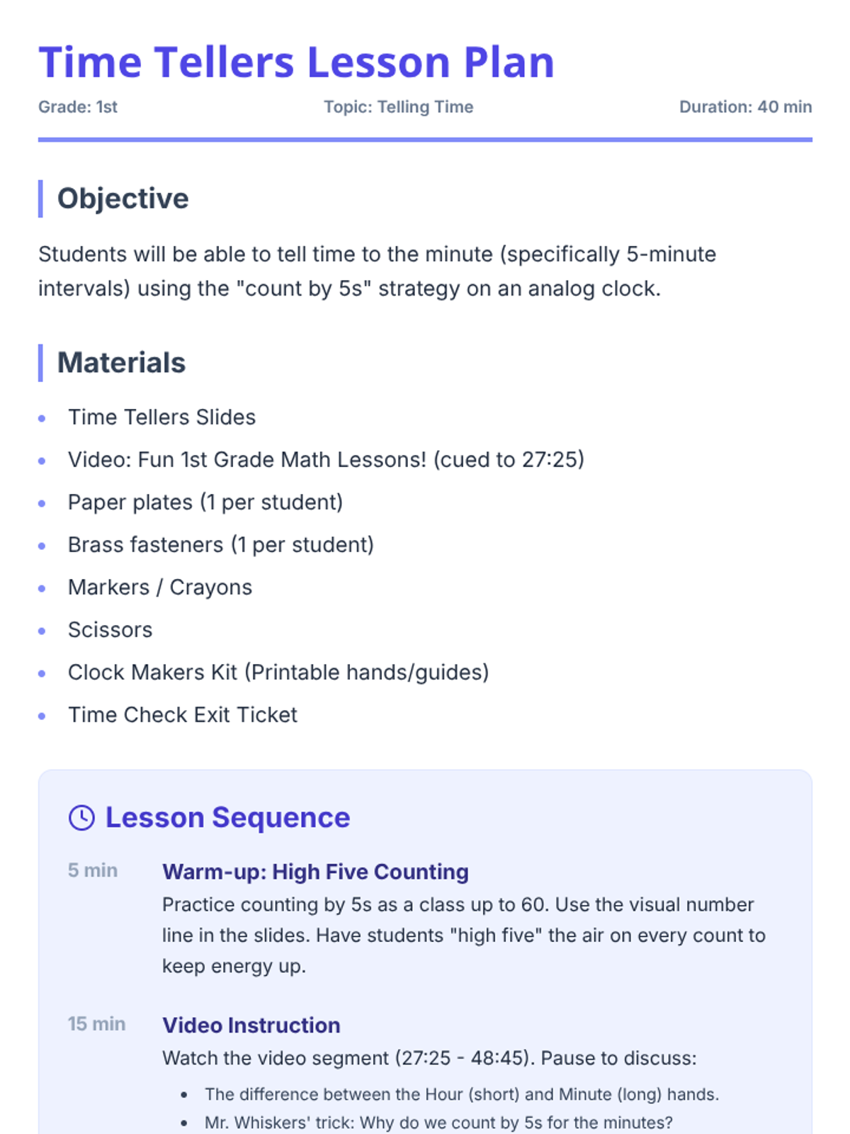 A 1st Grade math lesson on telling time to the minute using the 'count by 5s' strategy, featuring a video, a hands-on paper plate clock activity, and an exit ticket.