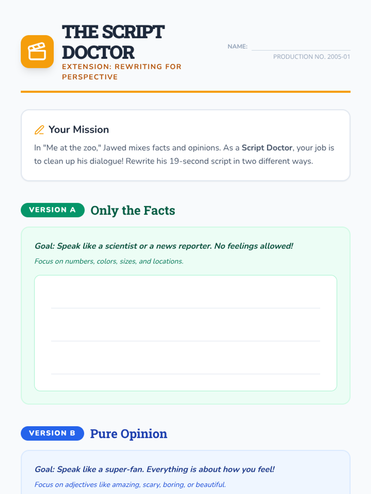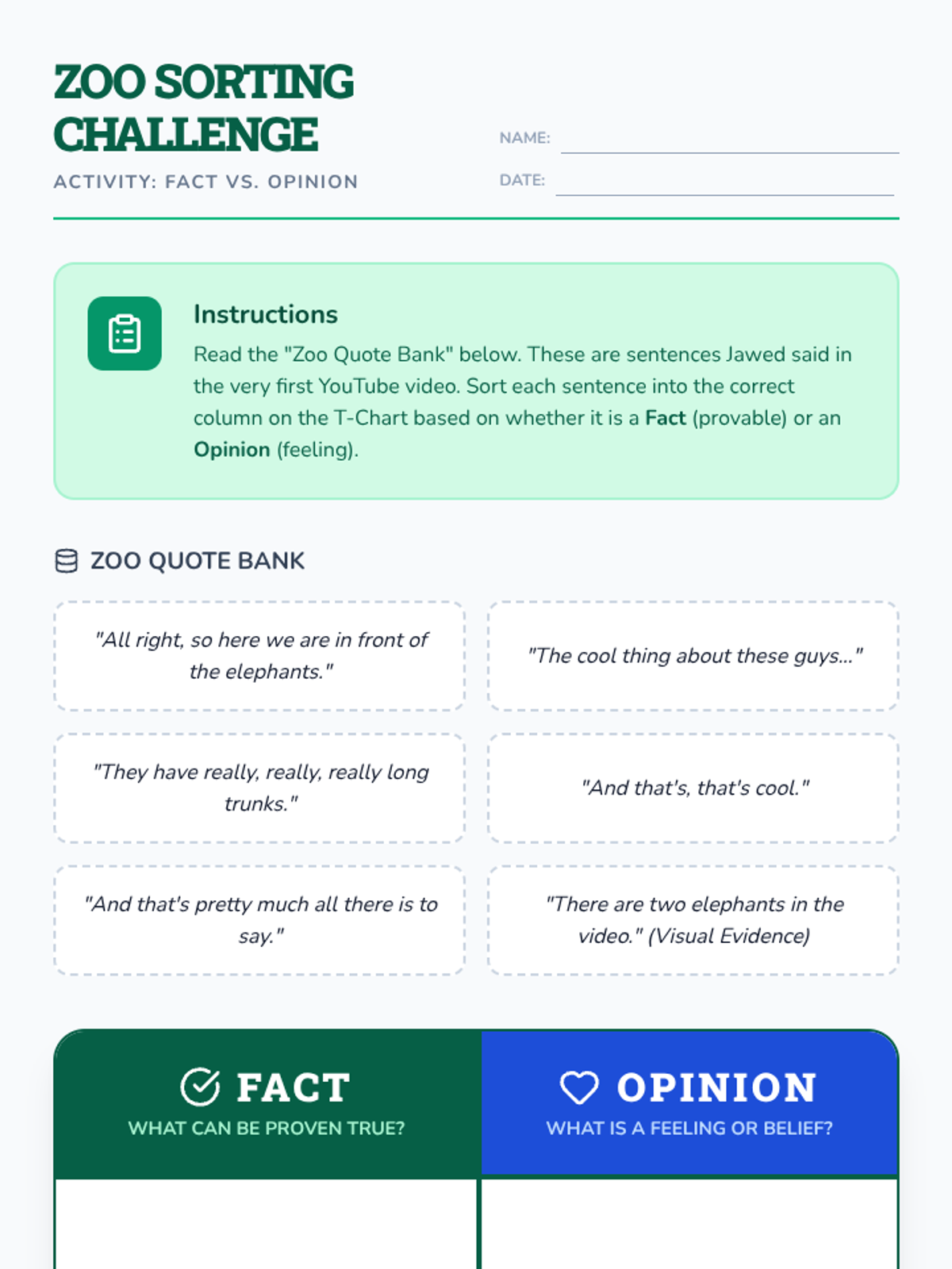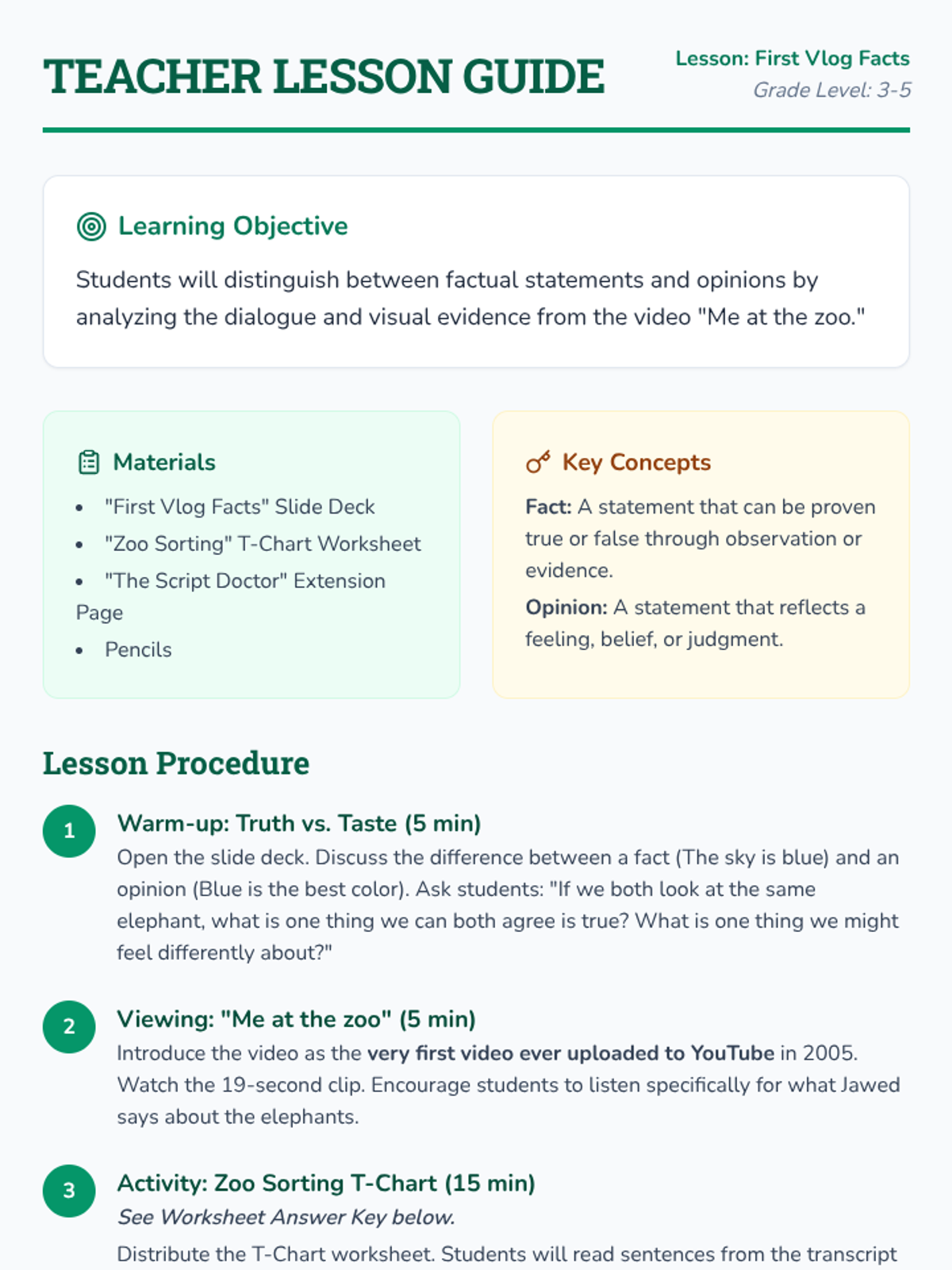 A lesson focusing on distinguishing between factual observations and opinions using the first YouTube video, 'Me at the zoo'. Students analyze dialogue and imagery to understand how word choice influences information.