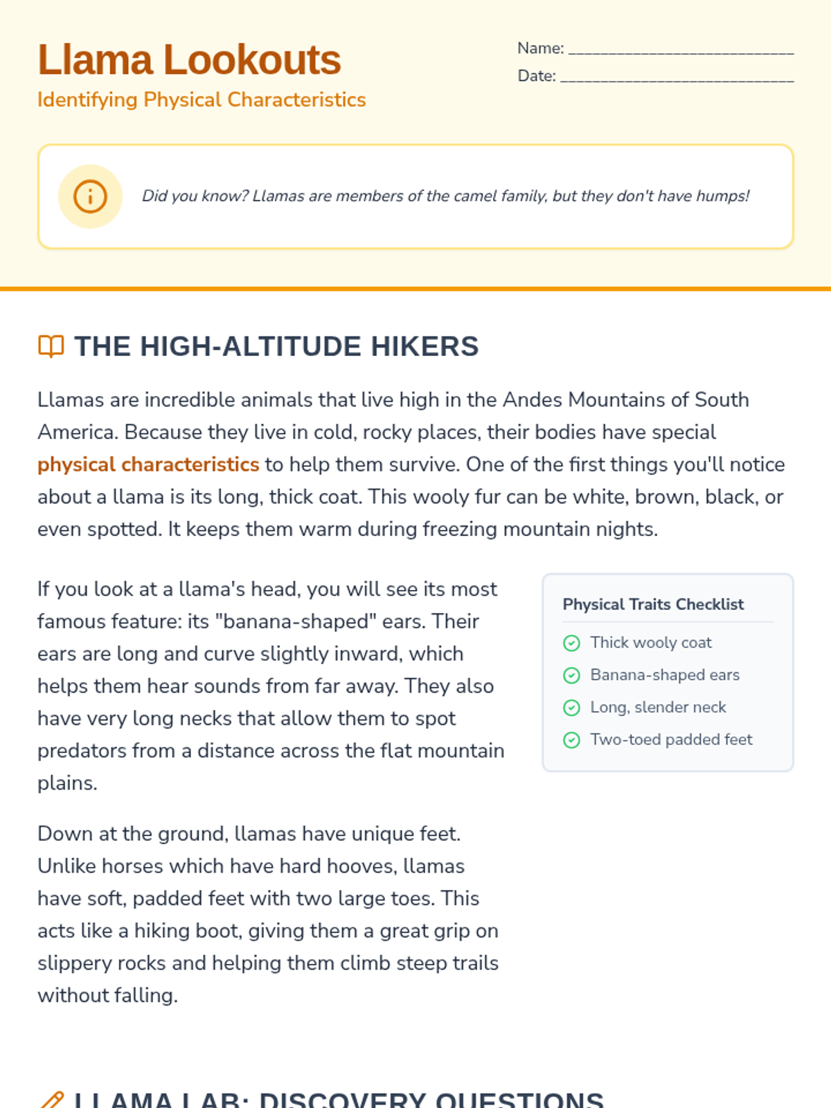 An engaging introduction to the unique physical features of llamas, designed for 4th-grade learners to practice identifying specific traits and adaptations.