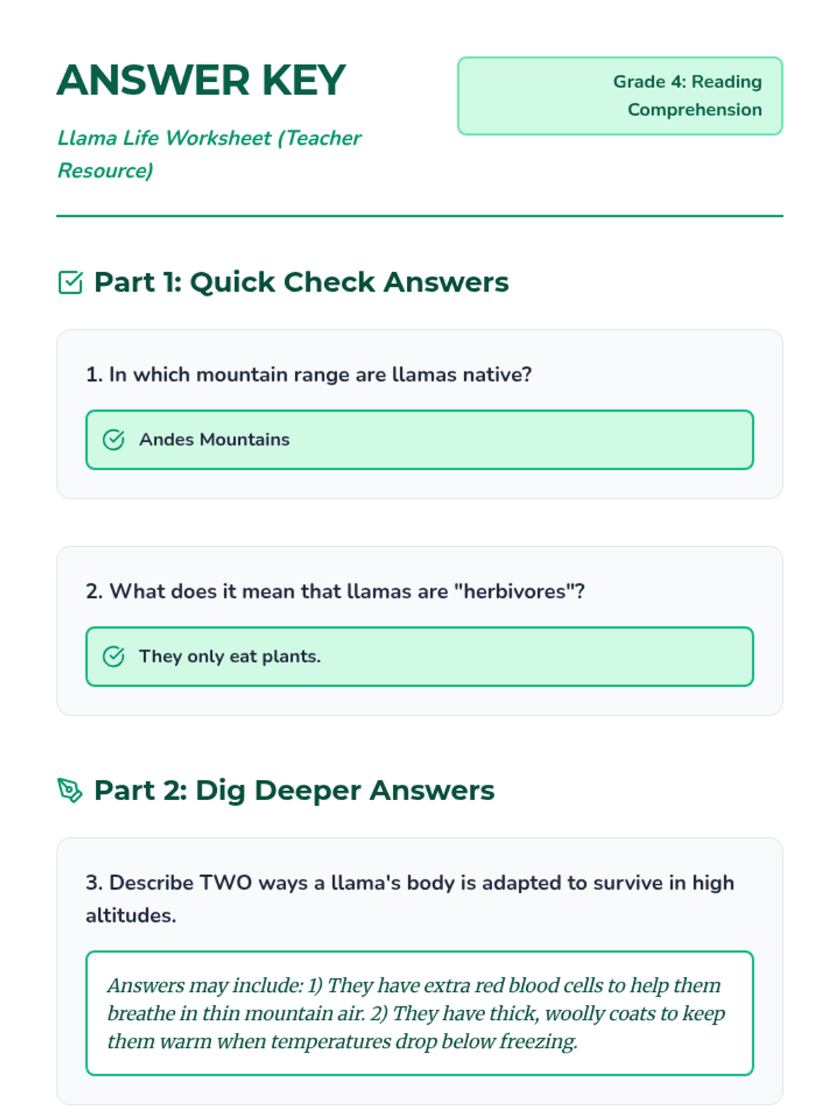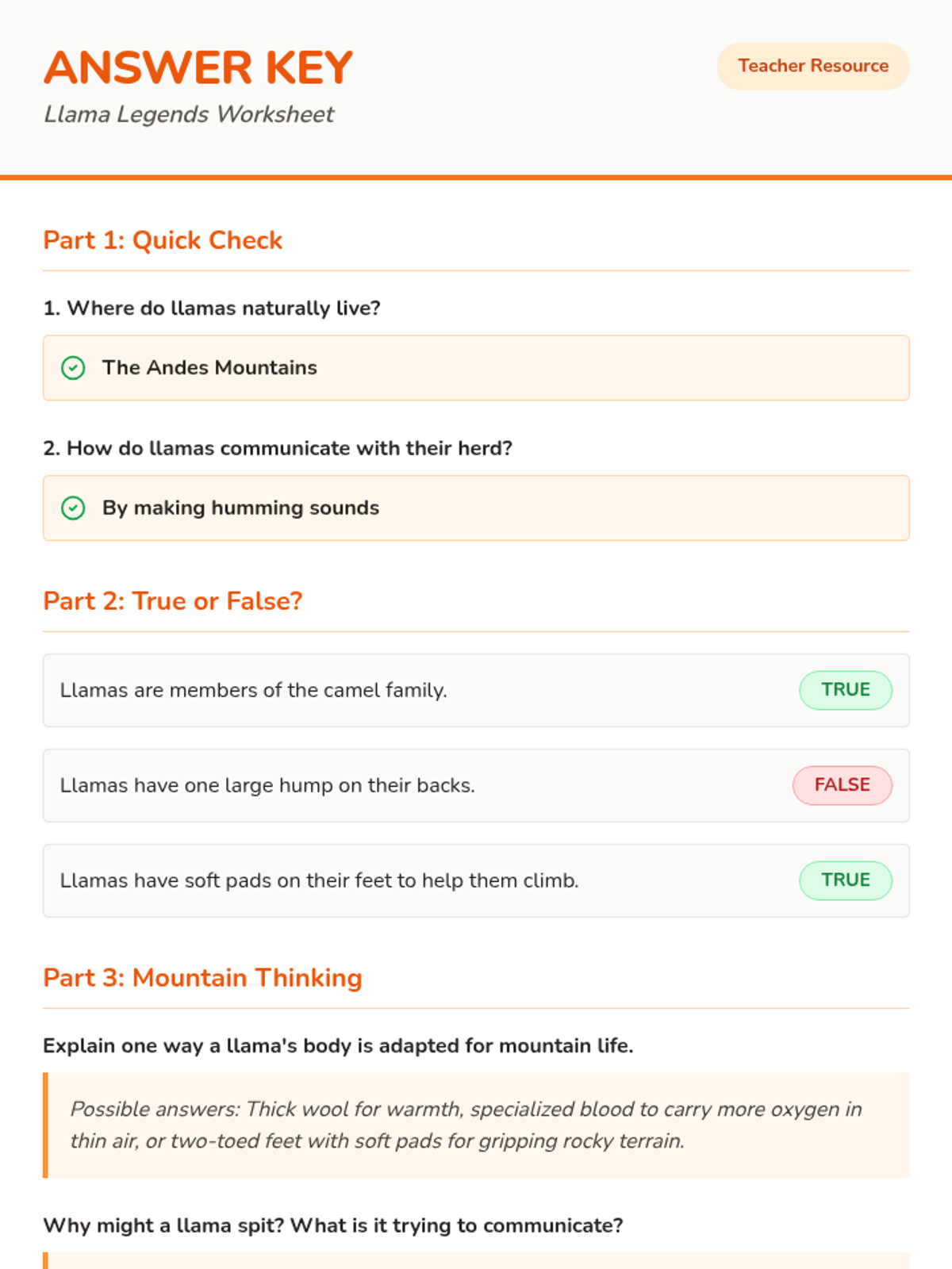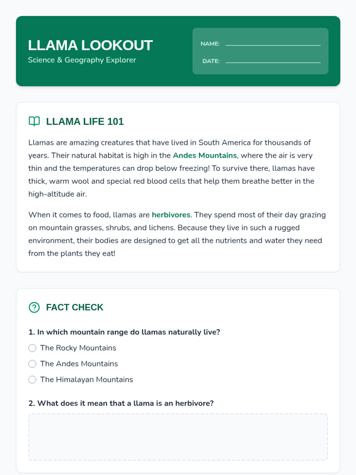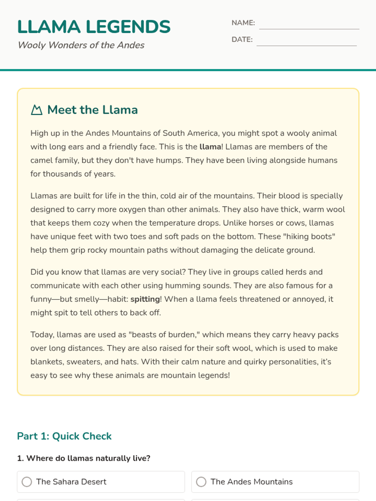 A comprehensive introduction to llamas for 4th graders, focusing on their native habitat in the Andes Mountains and their herbivorous diet. Students will explore physical adaptations and behavioral traits through a visual presentation and a reading comprehension worksheet.