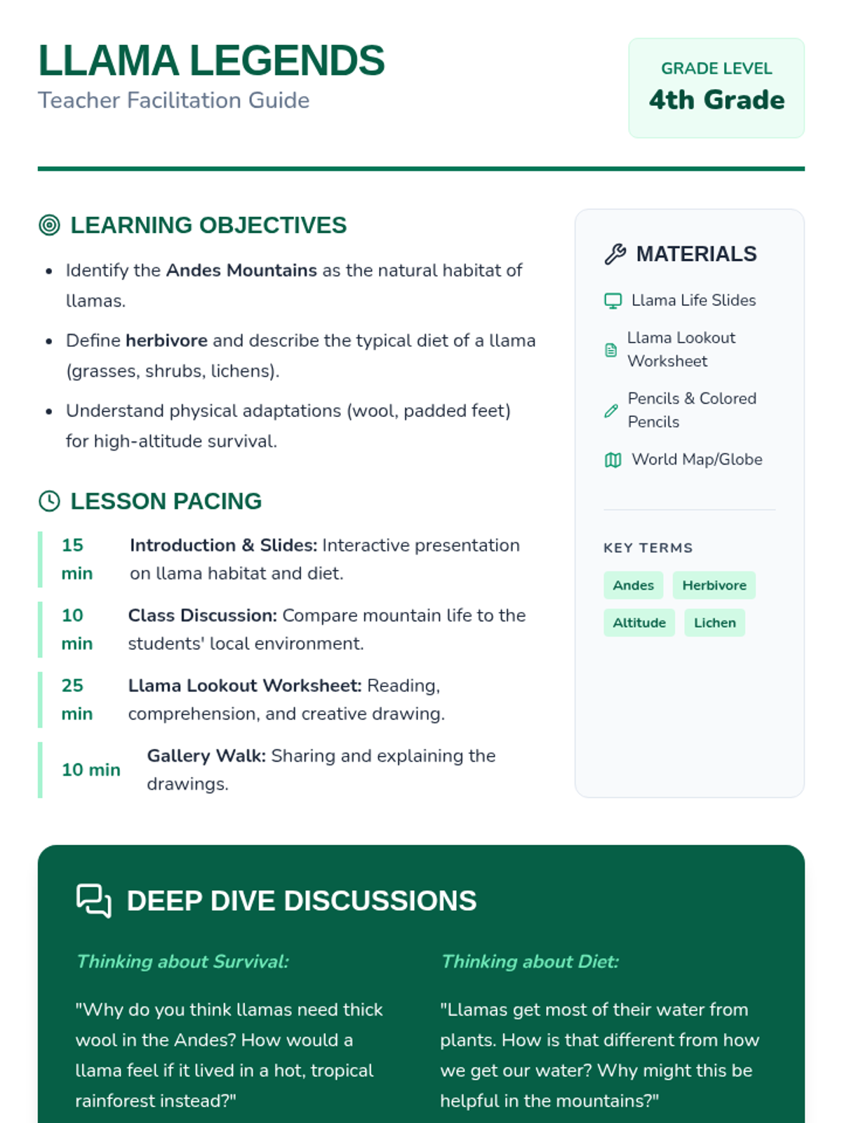 An engaging introductory lesson for 4th graders about the biology, habitat, and history of llamas, focusing on their unique adaptations and role in Andean culture.
