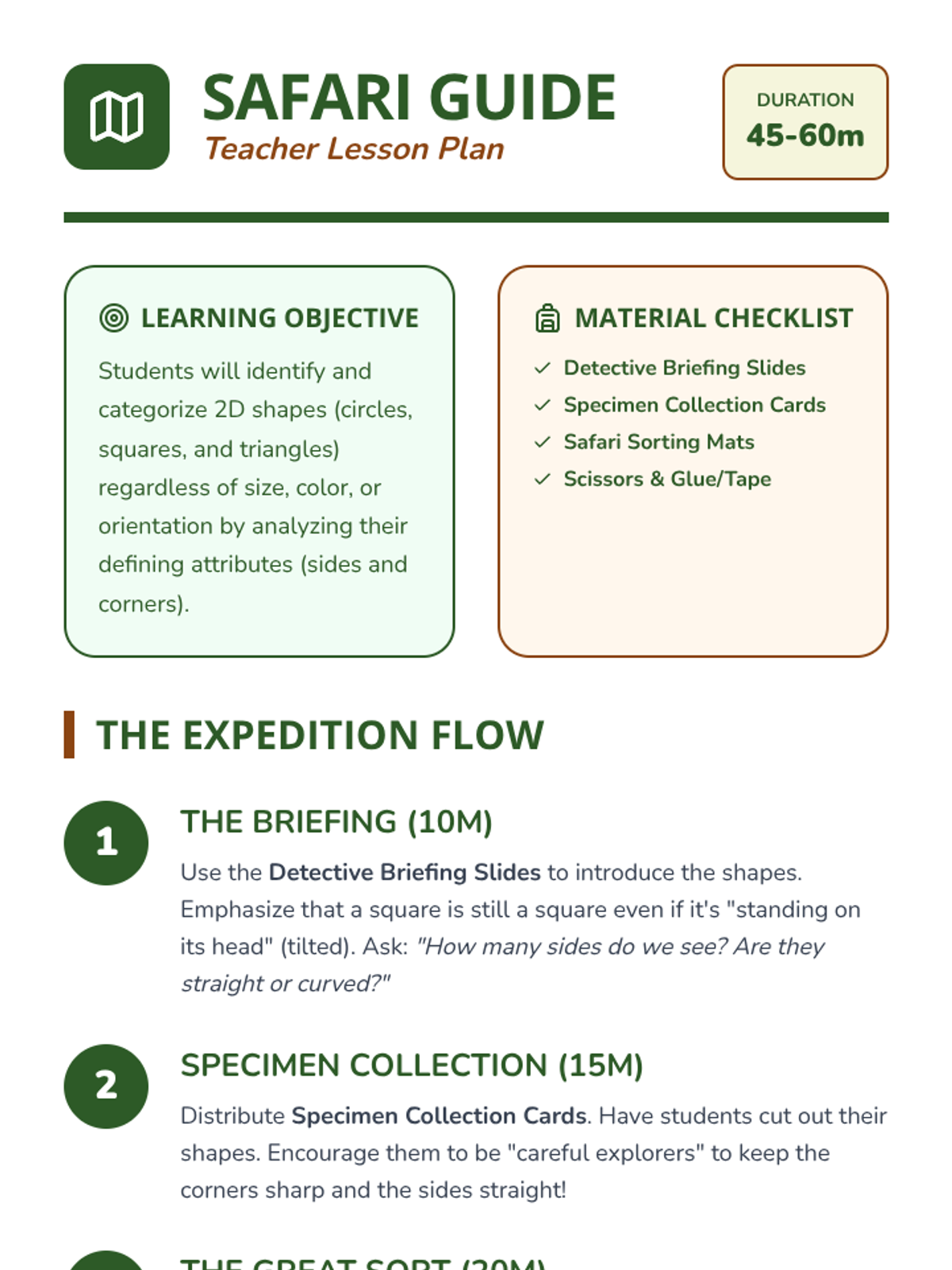 A fun, hands-on lesson where students identify and sort circles, squares, and triangles through a 'Shape Safari' adventure. Students will practice recognizing shapes in different sizes, colors, and orientations.