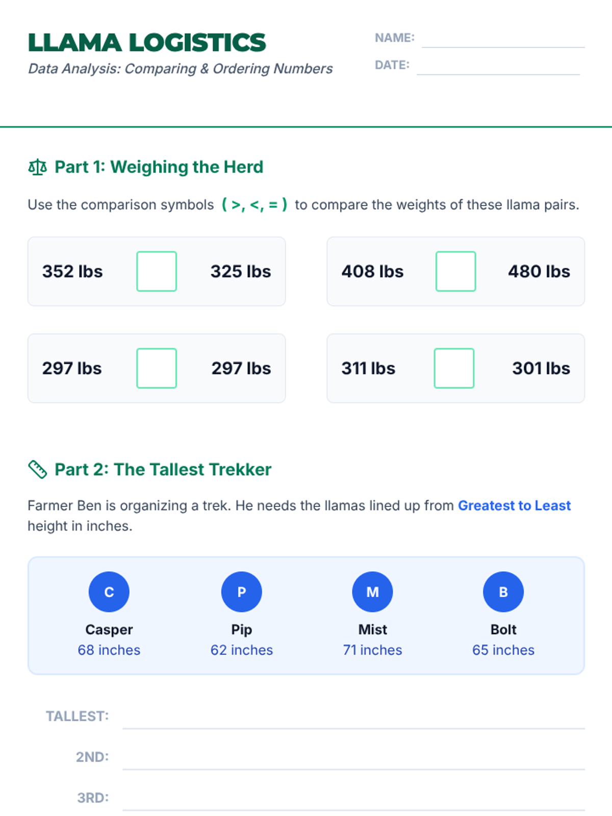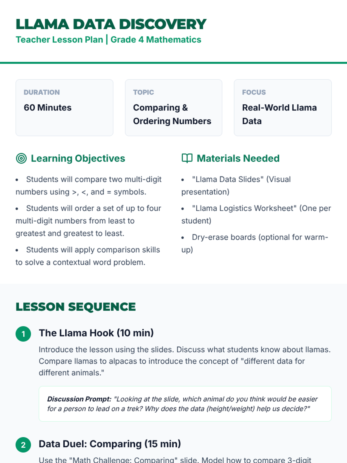 A comprehensive math-focused lesson exploring the world of llamas through data comparison, ordering, and real-world application for 4th-grade students.