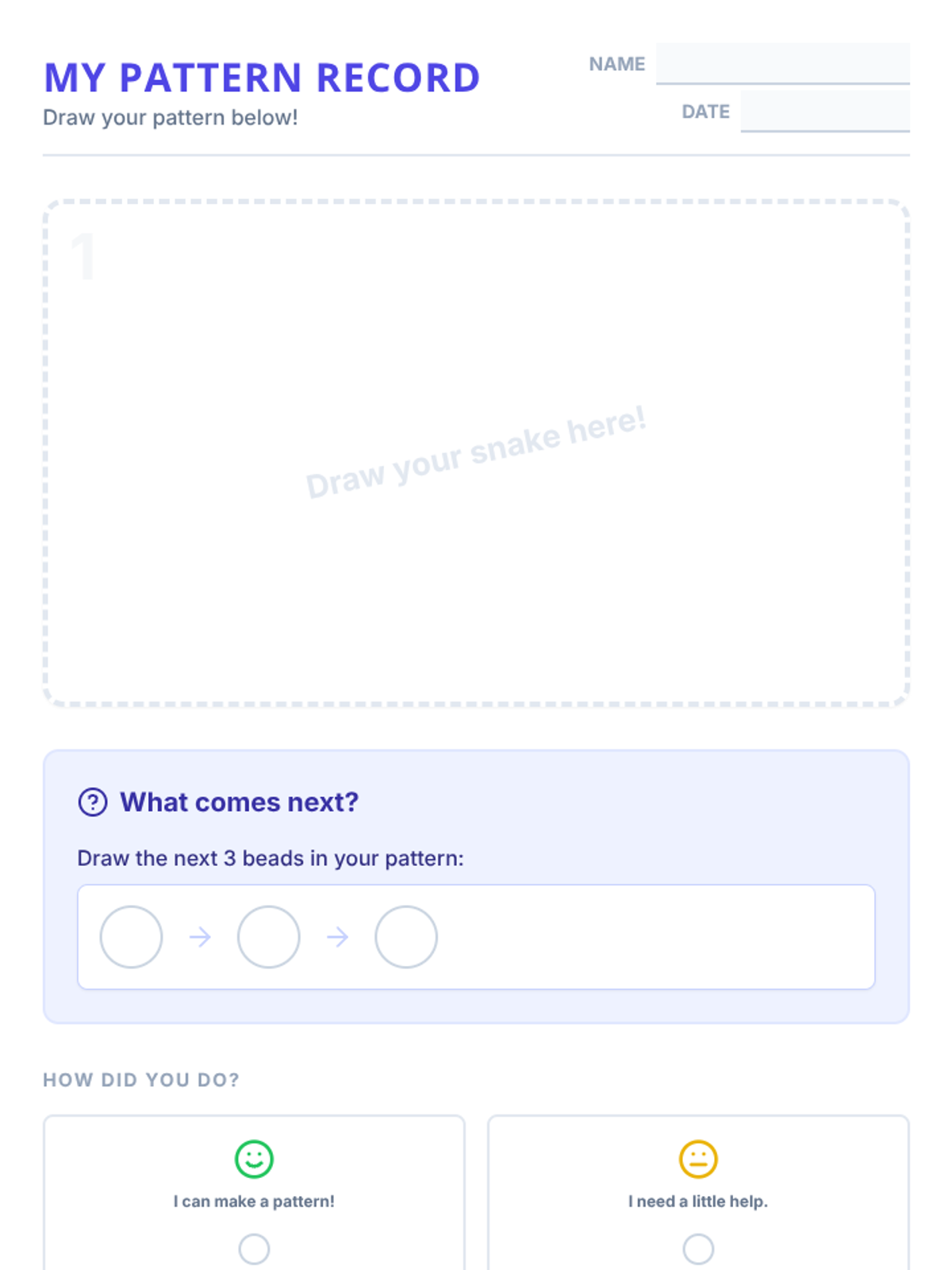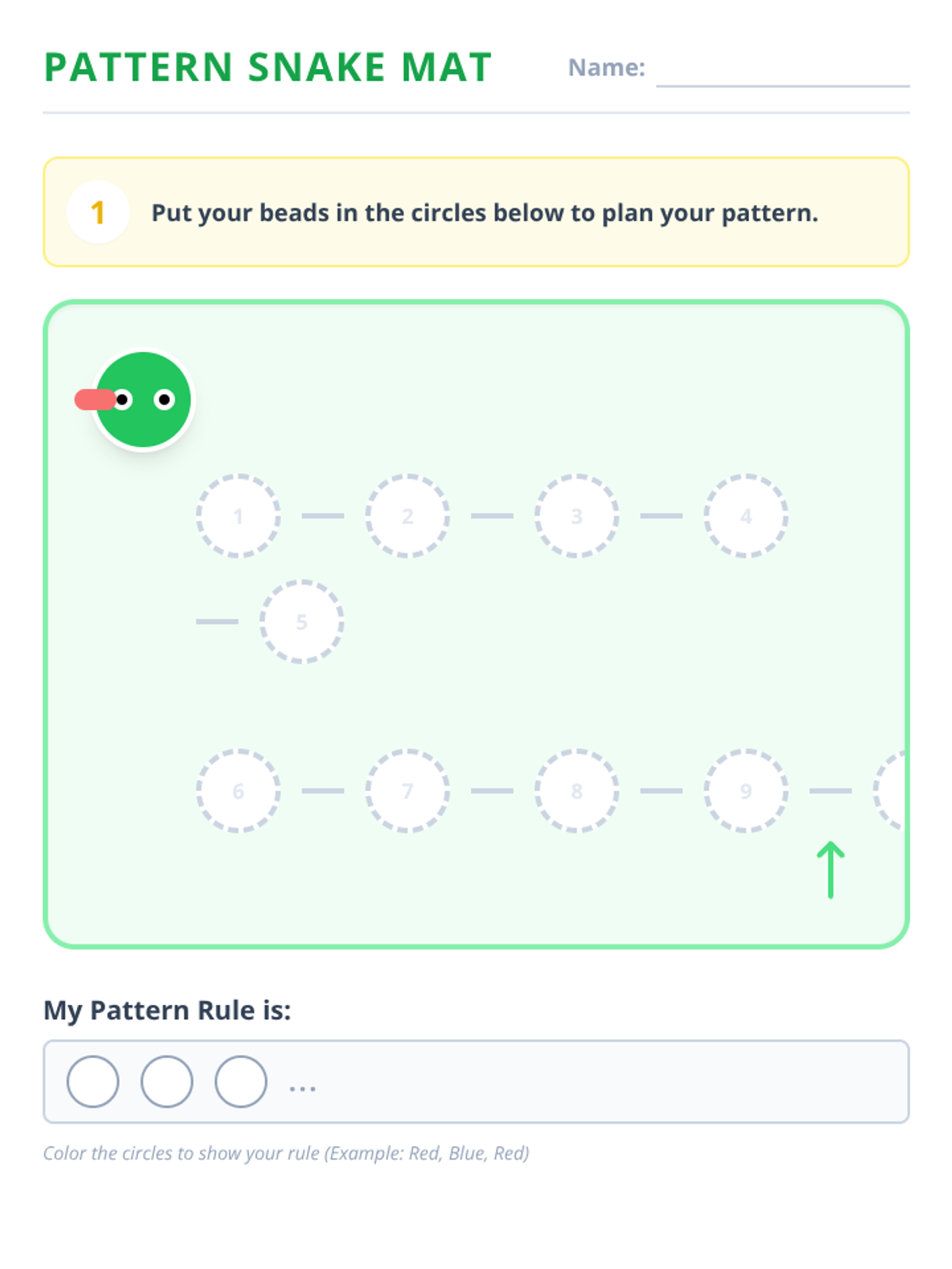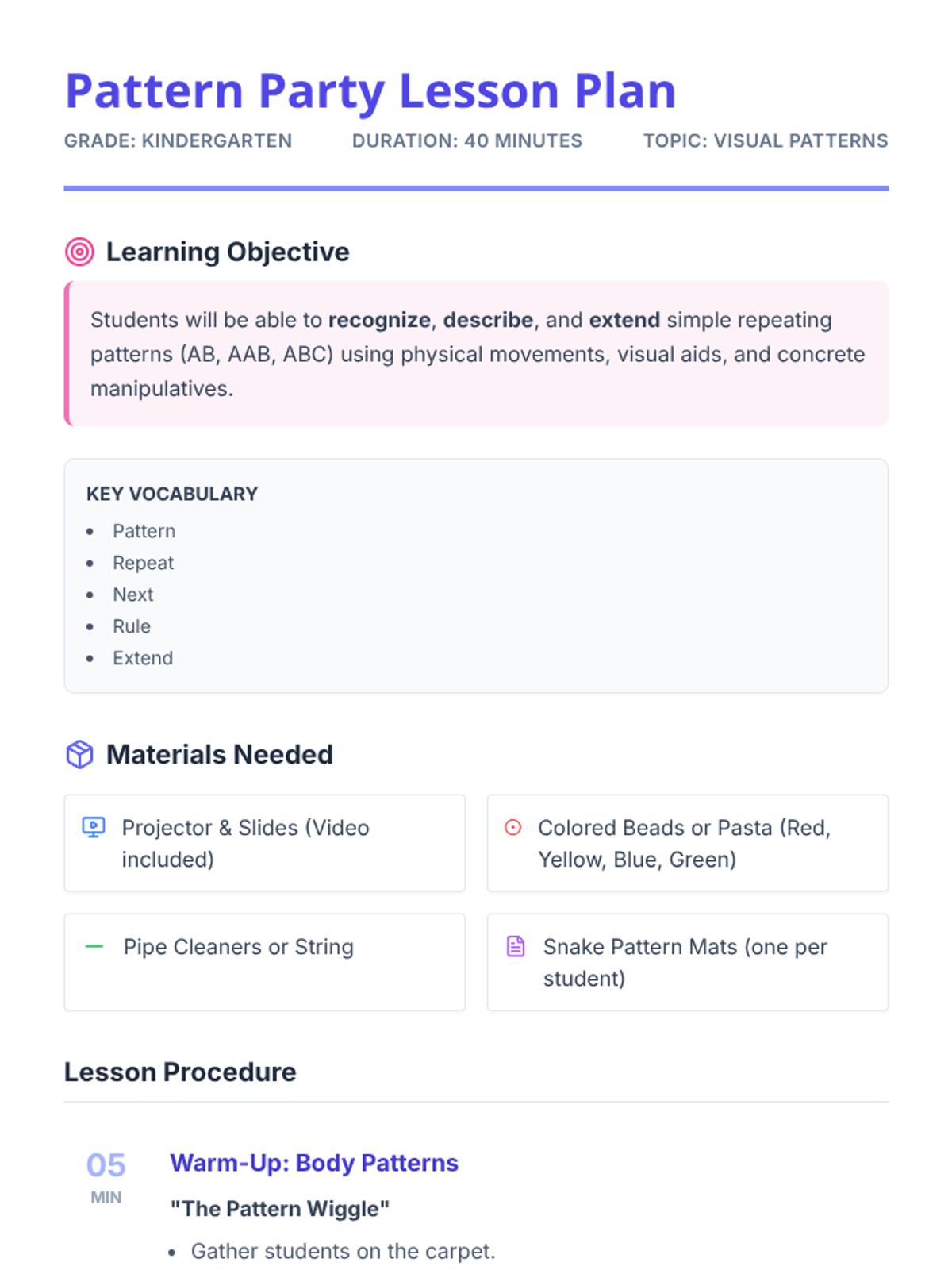 A Kindergarten lesson focused on recognizing and extending simple visual patterns using movement, video, and hands-on bead stringing.