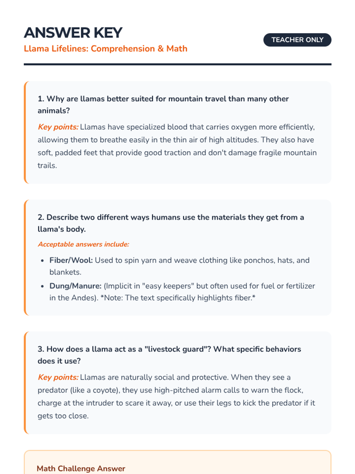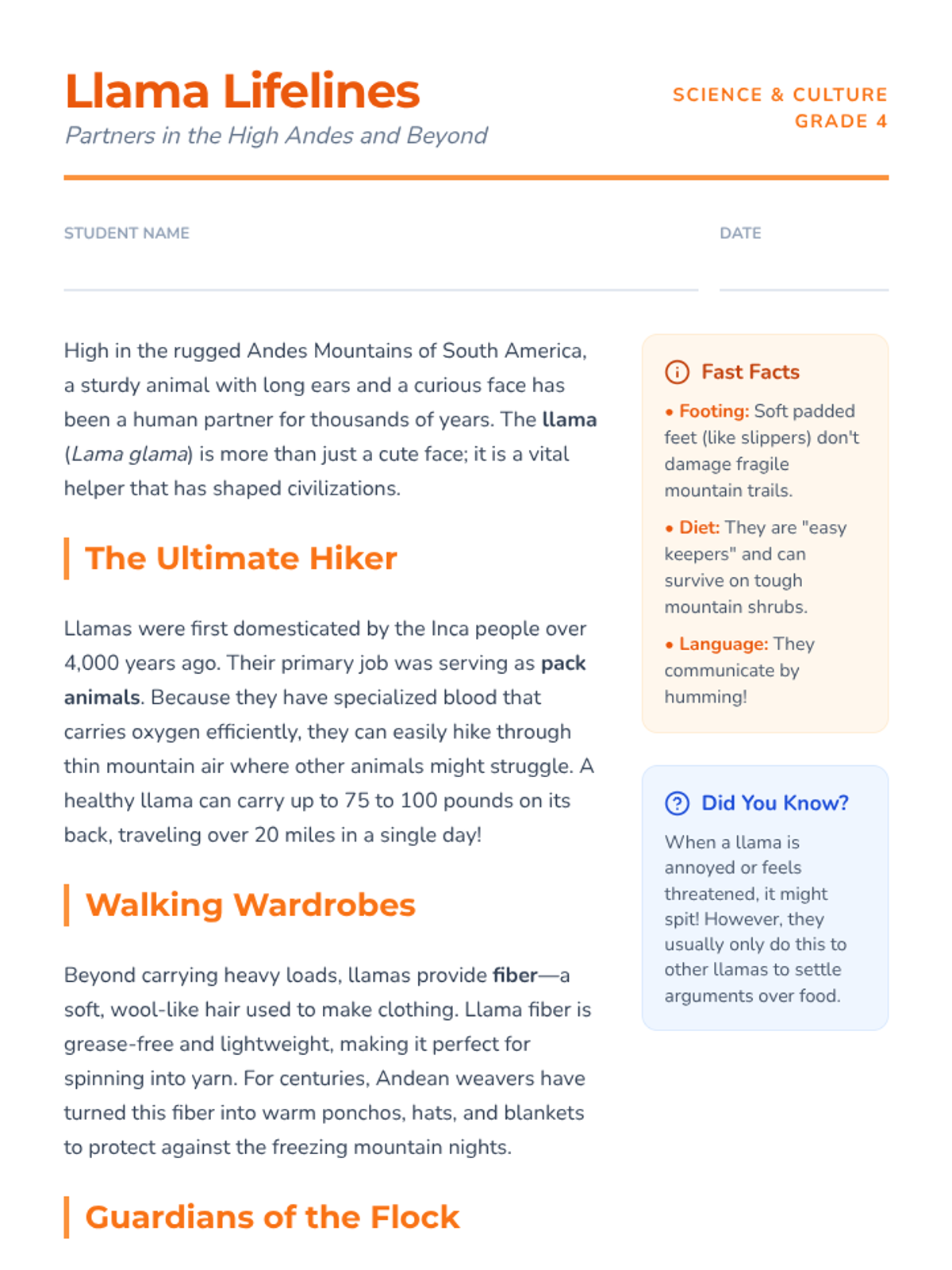 An engaging exploration of llama biology, behavior, and social structures, integrating 4th-grade reading comprehension and fractional math concepts.