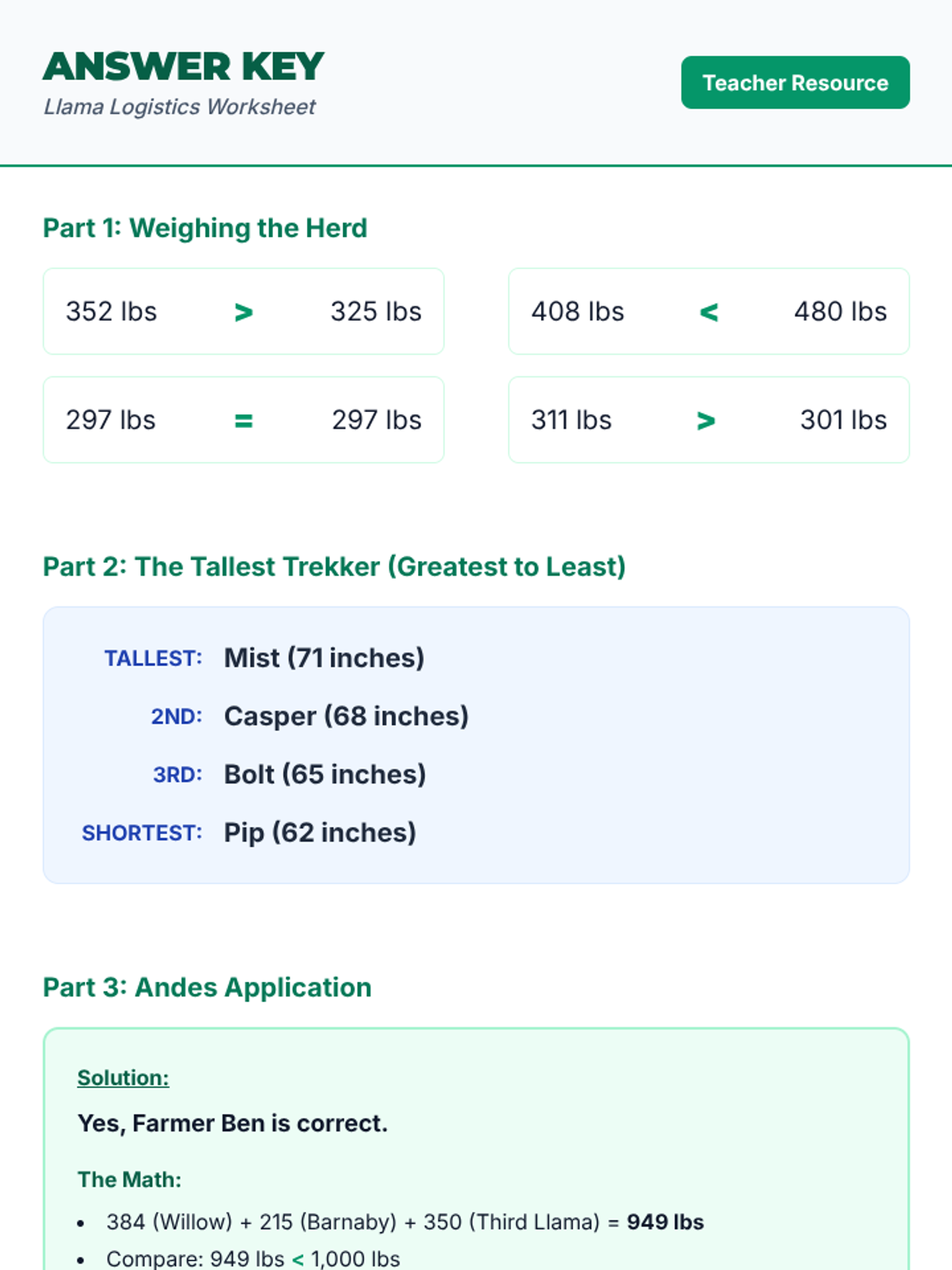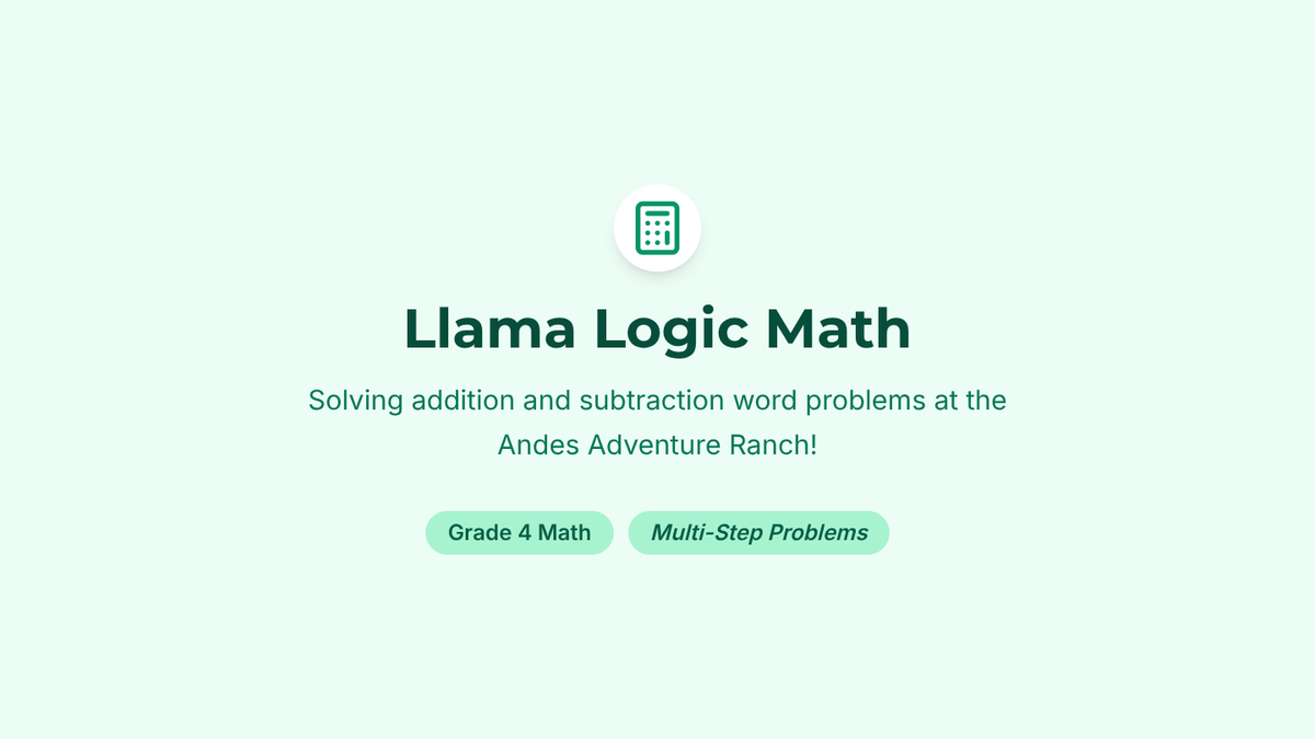 A fun, llama-themed math lesson where 4th graders practice multi-digit multiplication and long division through a simulated llama trekking adventure. Students will calculate supplies, manage herd logistics, and solve real-world problems.