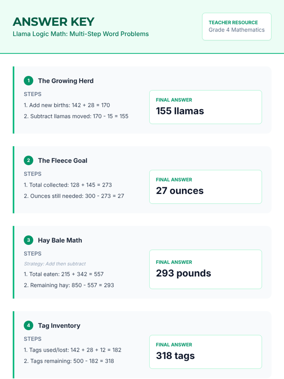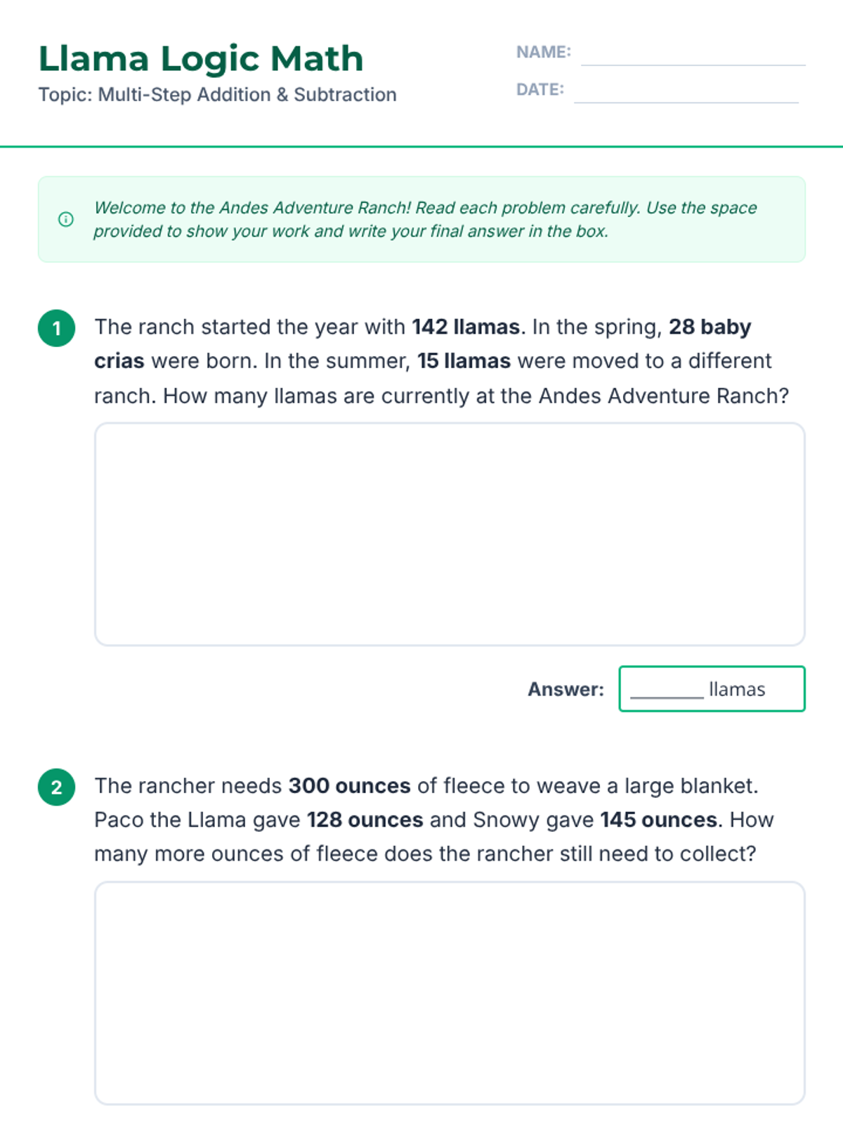 A fun and engaging lesson where 4th graders solve multi-step addition and subtraction word problems themed around a llama ranch. Students will practice calculating food requirements, fleece weights, and herd sizes.