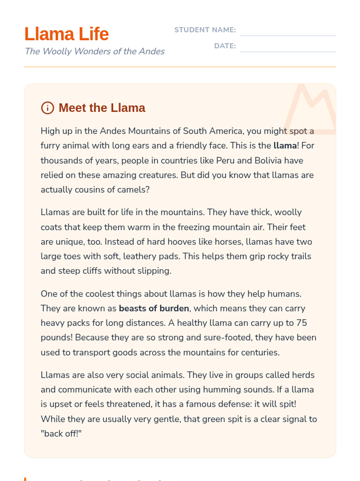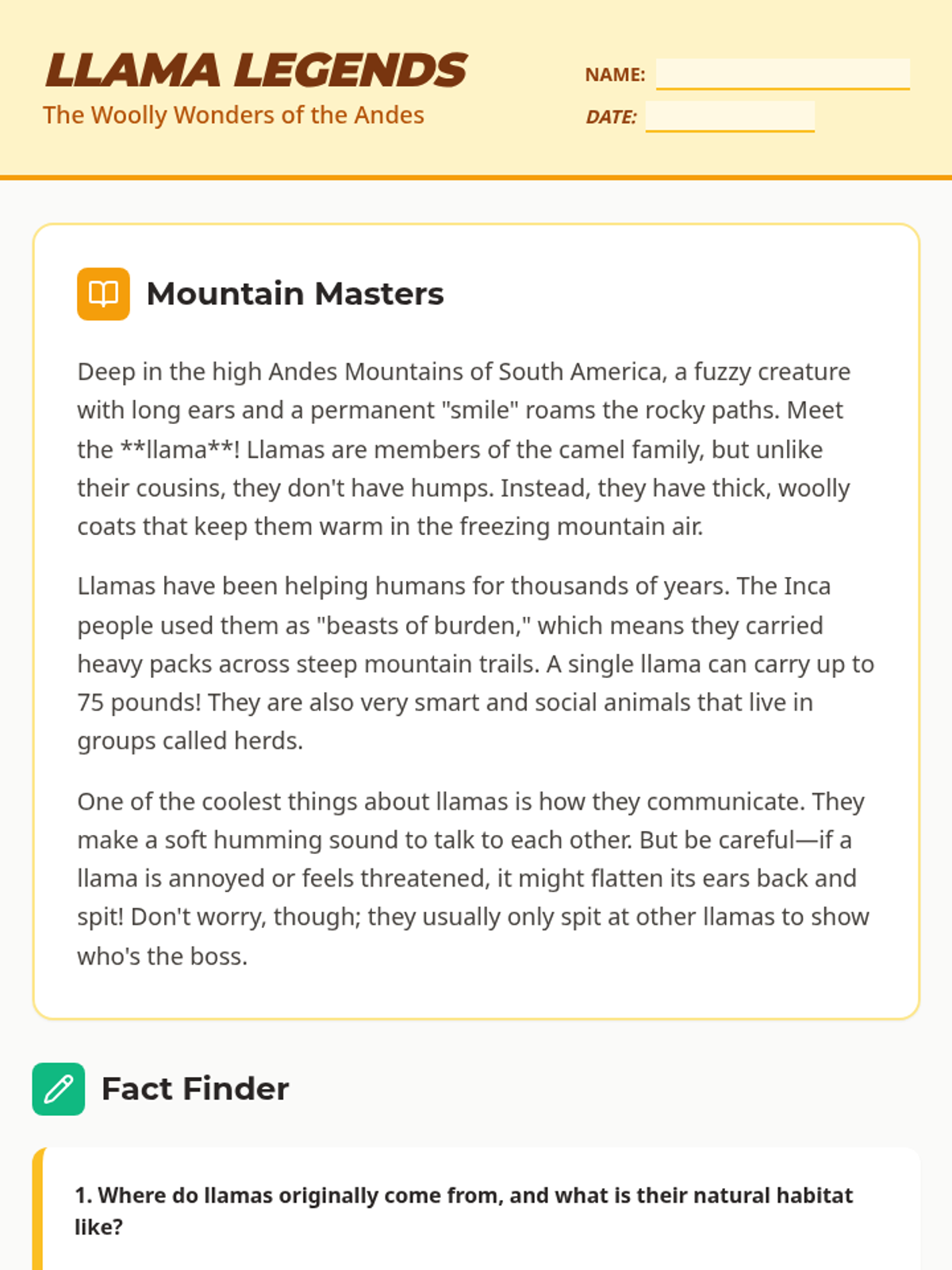 An engaging lesson for 4th graders exploring the unique physical adaptations and social behaviors of llamas, the 'camels of the clouds'.