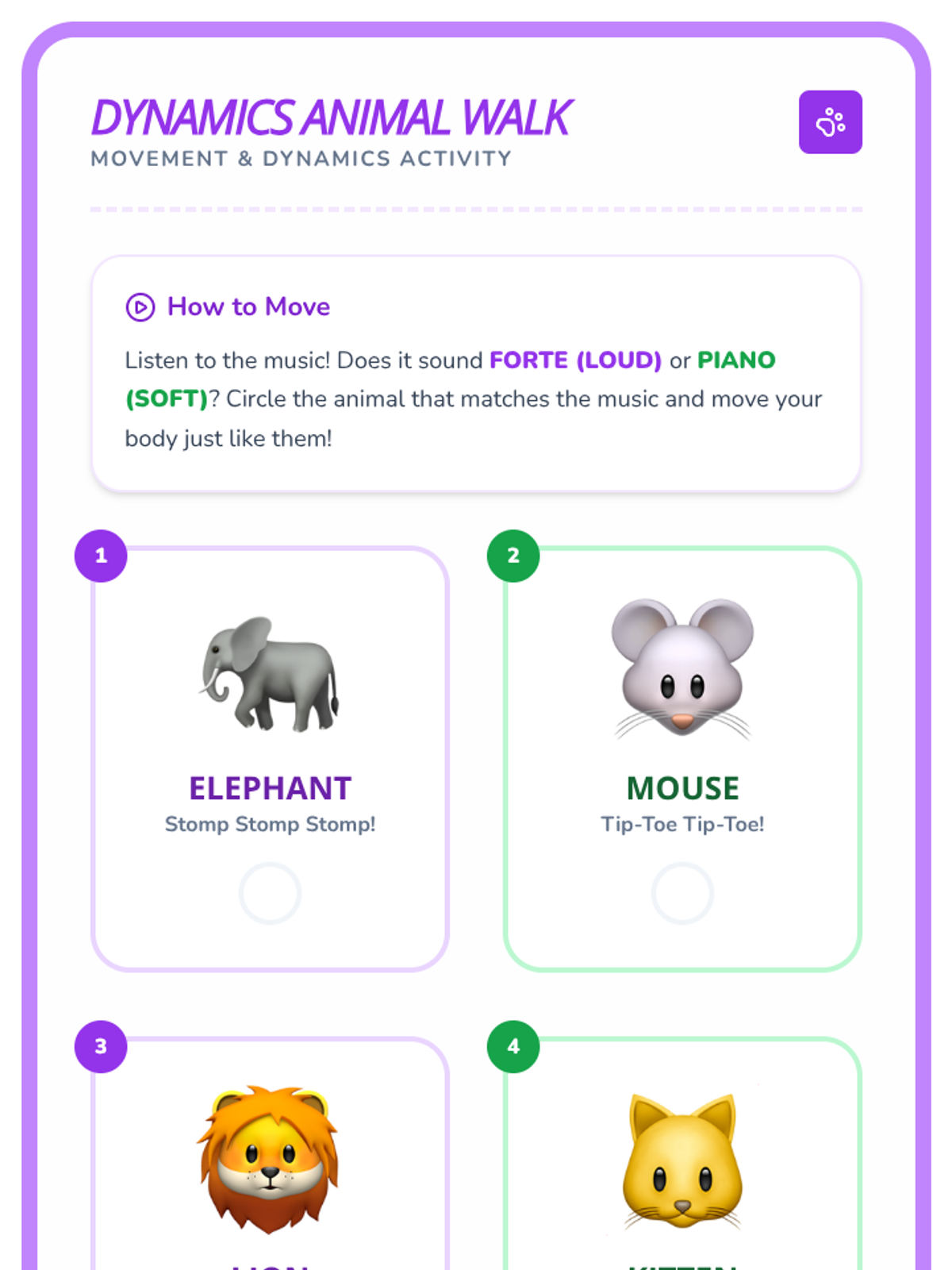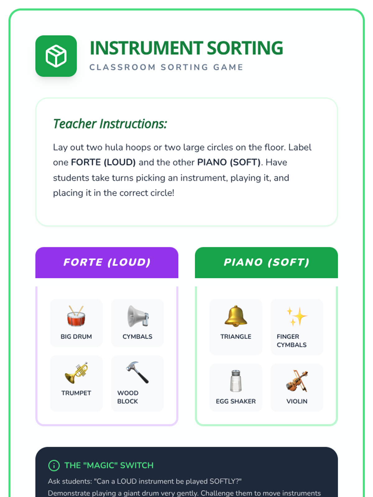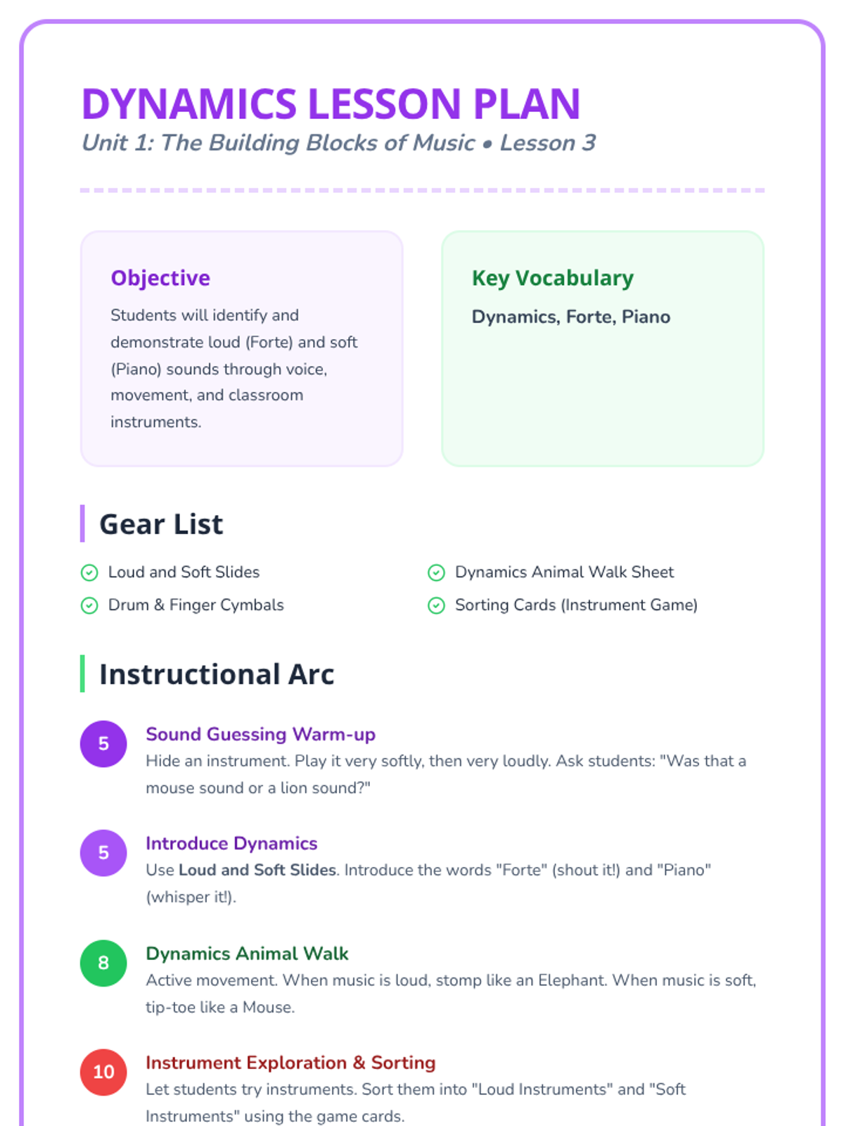 Students will be able to identify and demonstrate loud and soft sounds (dynamics) through voice, movement, and instruments.
