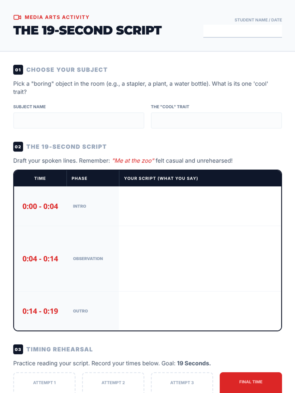 A media arts and oral communication lesson where students analyze the first YouTube video and create their own 19-second observational scripts.