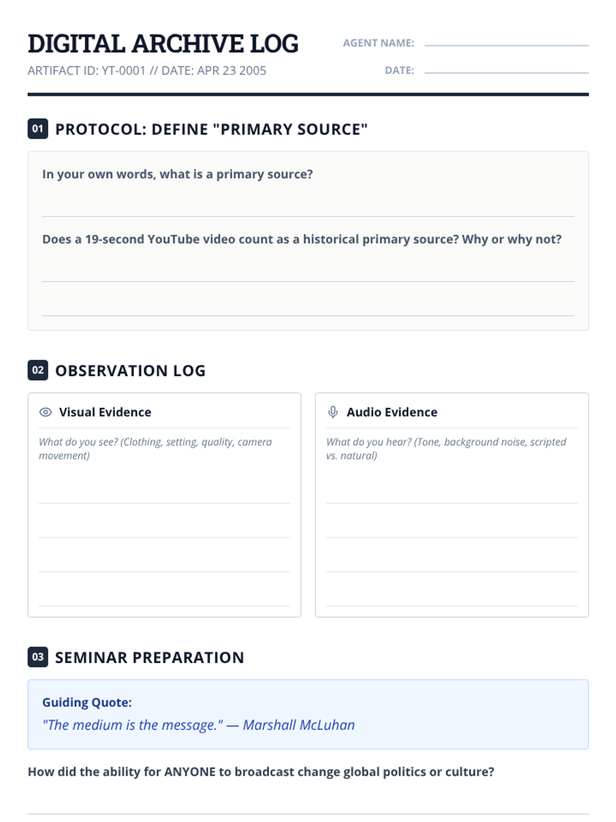 Students act as digital archaeologists to analyze 'Me at the zoo,' the first YouTube video, as a primary historical source, exploring how digital artifacts reflect their era and influence the global economy.
