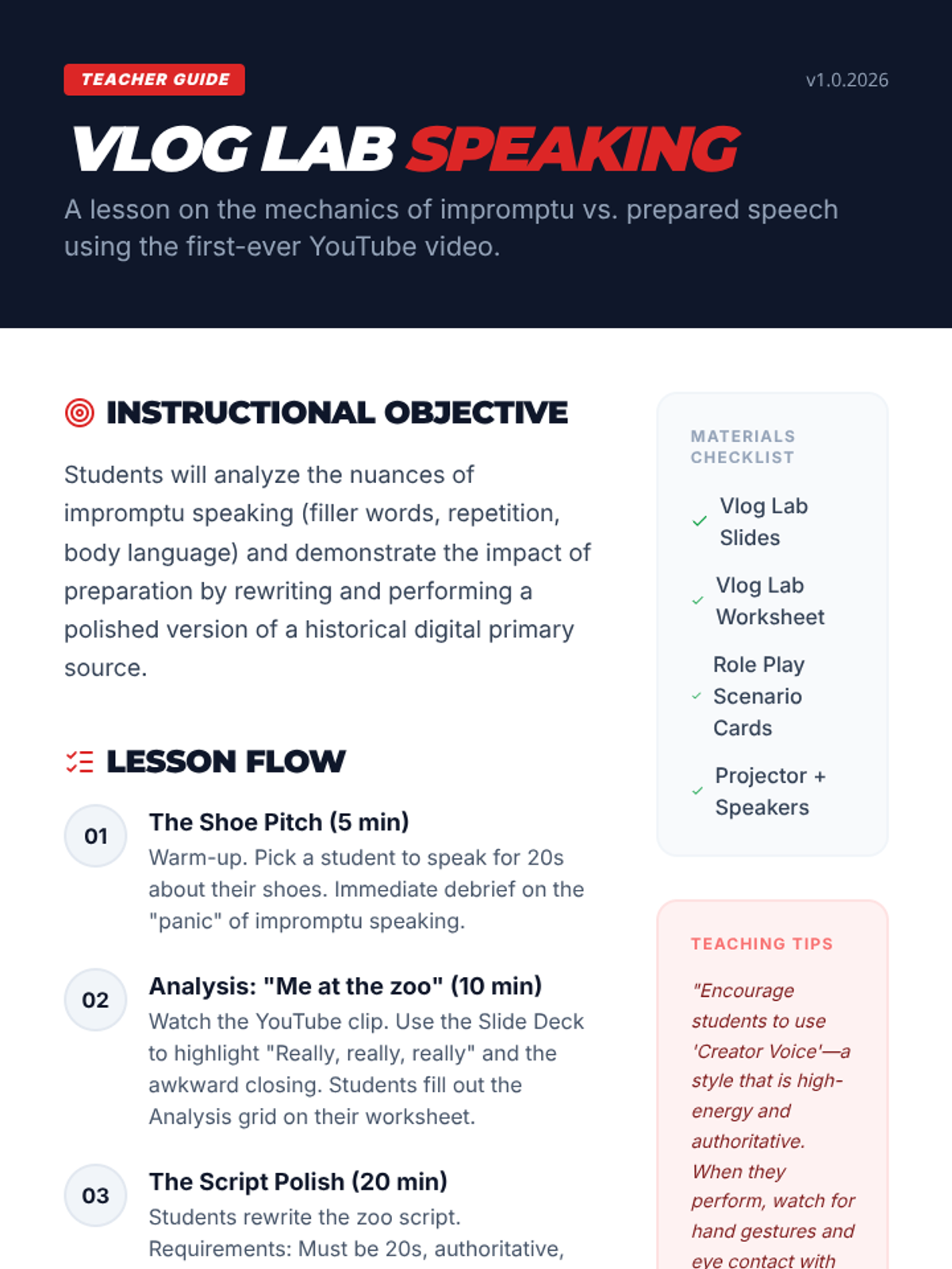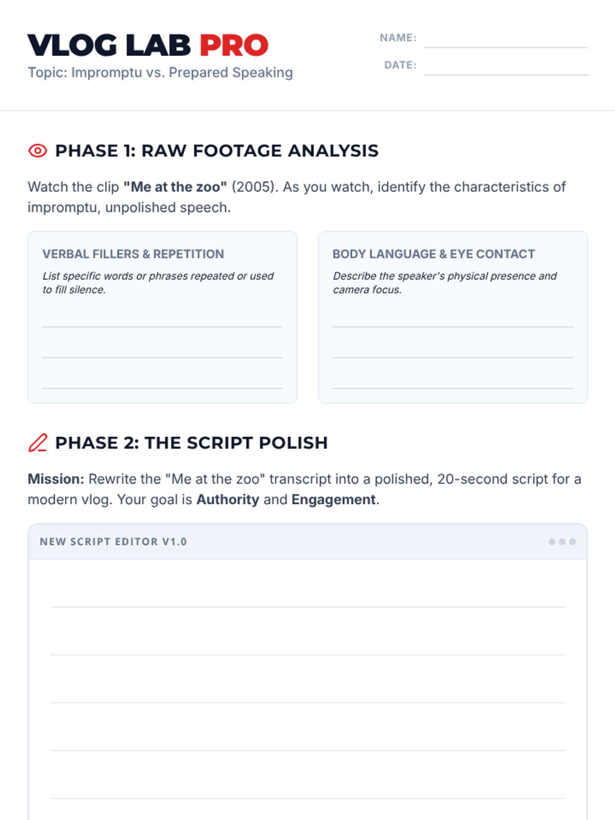 A Speech & Debate/ELA lesson where students analyze 'Me at the zoo' to understand the differences between impromptu and prepared speaking, ending with a script-polishing activity.
