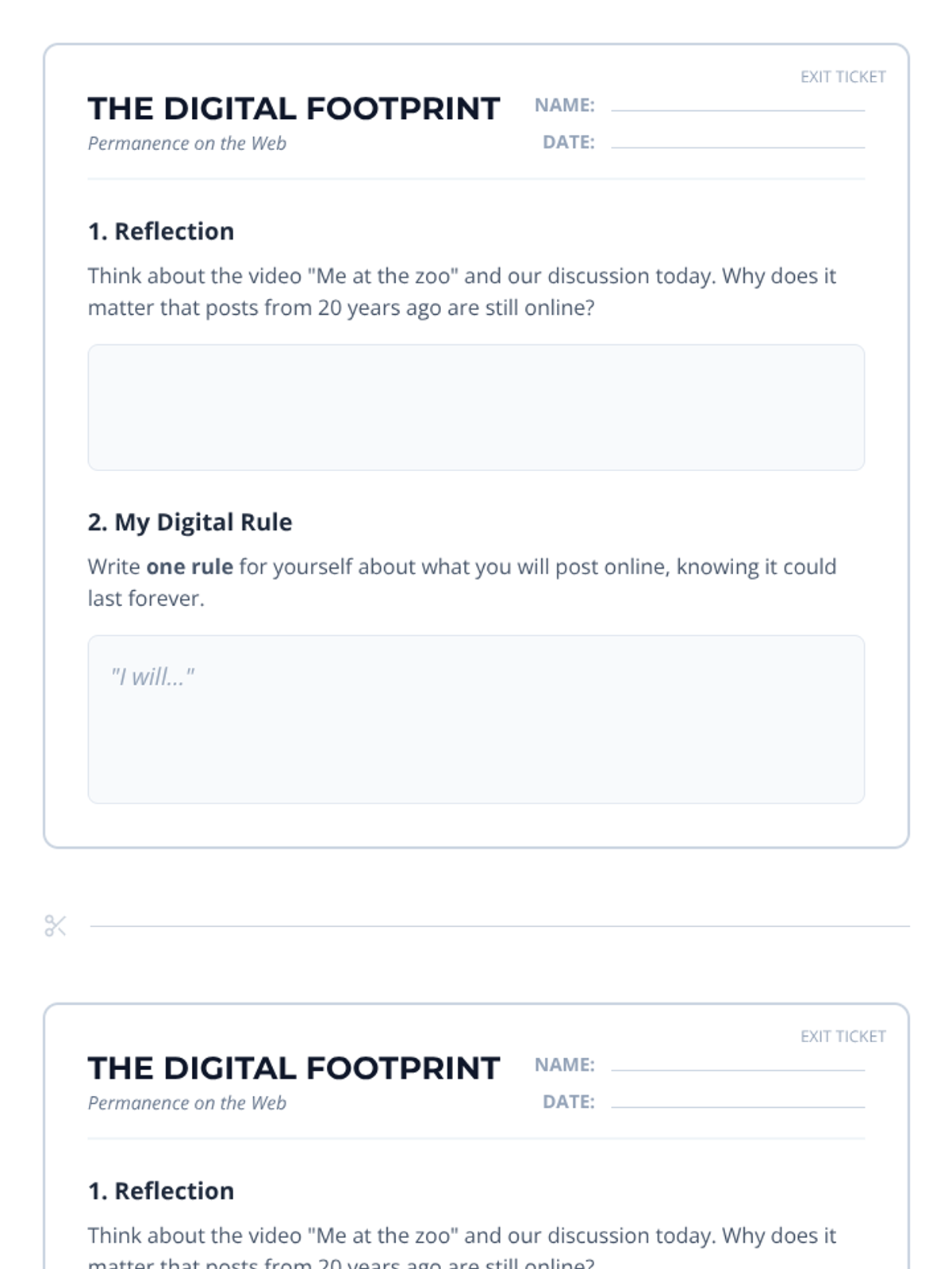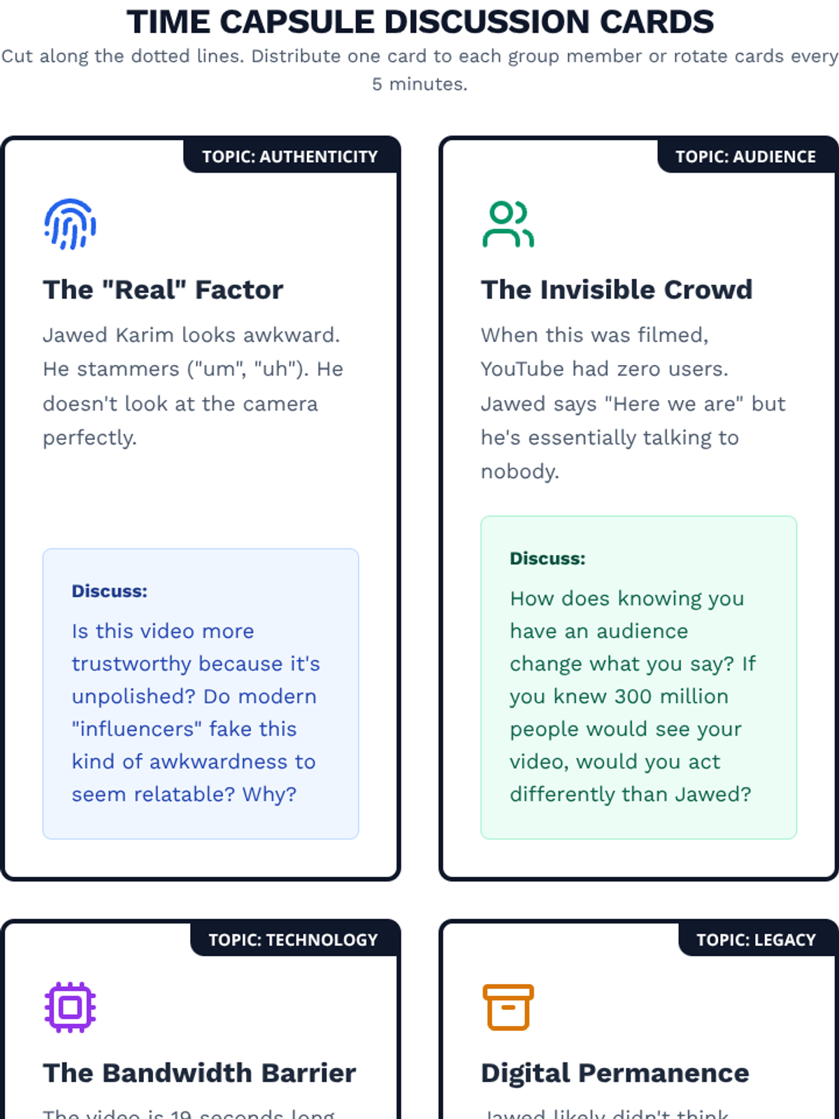 A sociology and technology lesson analyzing the concept of 'Digital Footprint' and internet permanence through the lens of the first-ever YouTube video, 'Me at the zoo'. Students explore the shift from unscripted early internet content to modern curation and reflect on their own digital legacies.