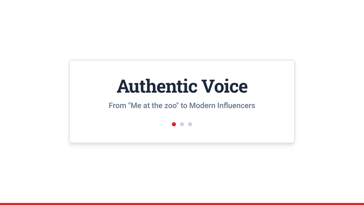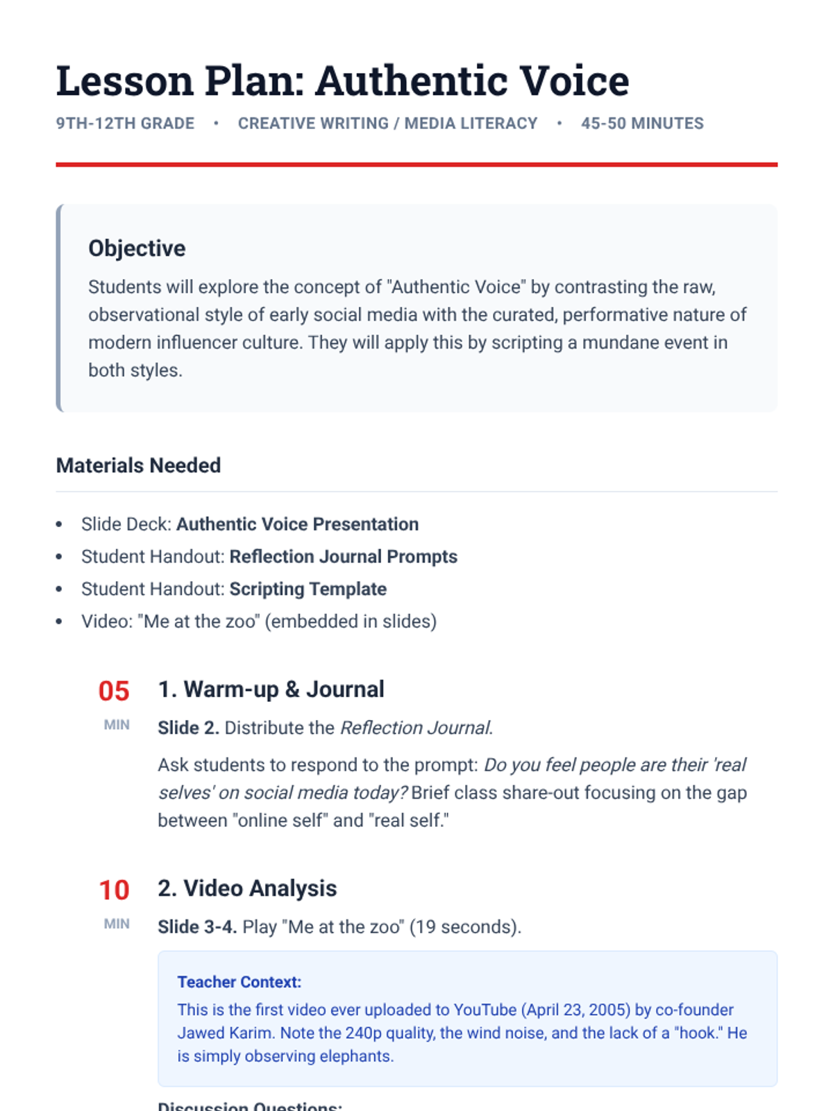 A lesson for high school students exploring the concept of 'Authentic Voice' in media, comparing early social media content to modern influencer narratives using the first YouTube video as a case study.
