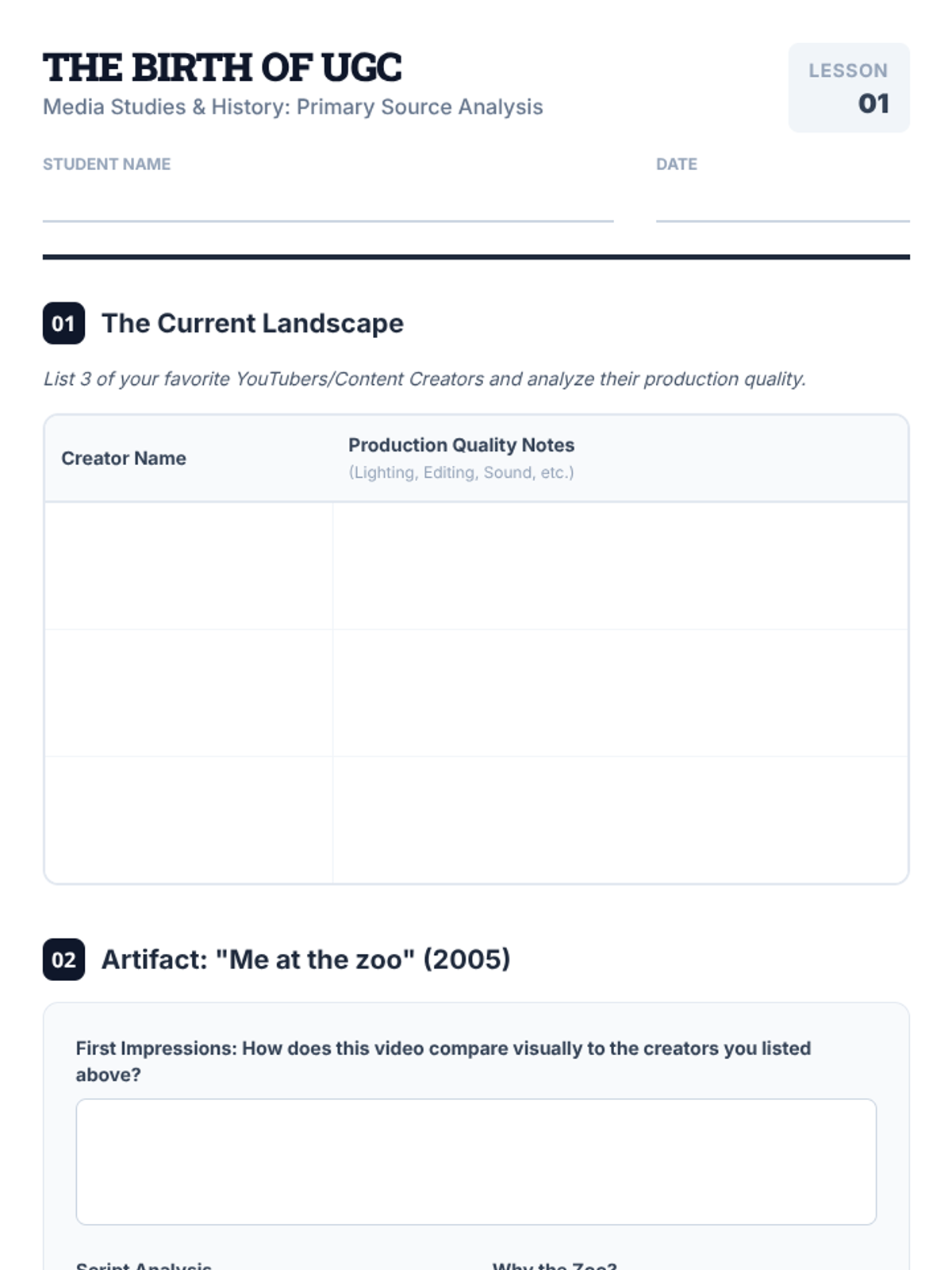 Students analyze the evolution of digital media by comparing the first-ever YouTube video, 'Me at the zoo,' with modern production standards, focusing on production quality, scripting, and the concept of user-generated content.