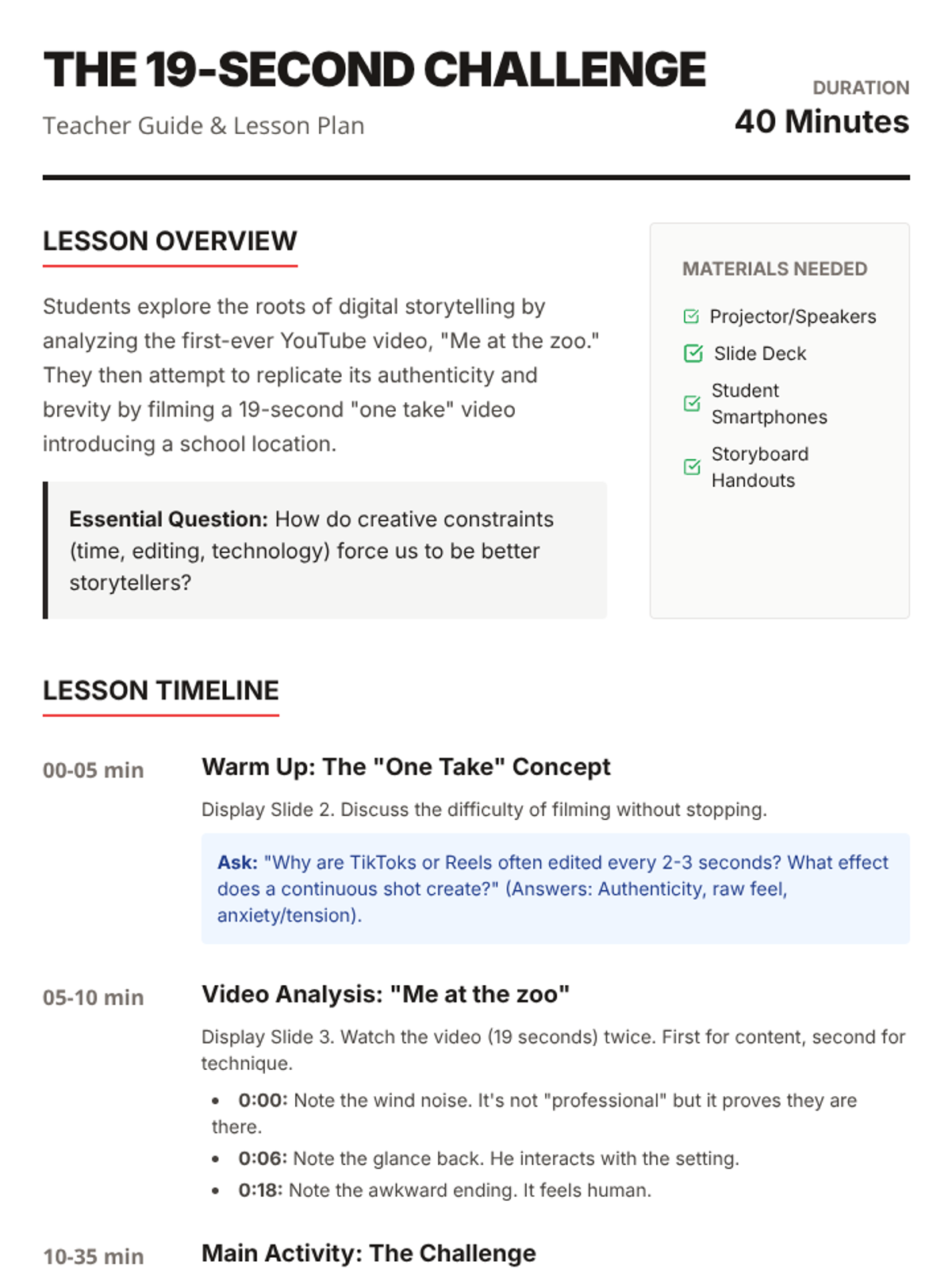 A lesson plan focusing on the evolution of user-generated content, starting with the first YouTube video 'Me at the zoo'. Students analyze early internet culture versus modern viral trends.