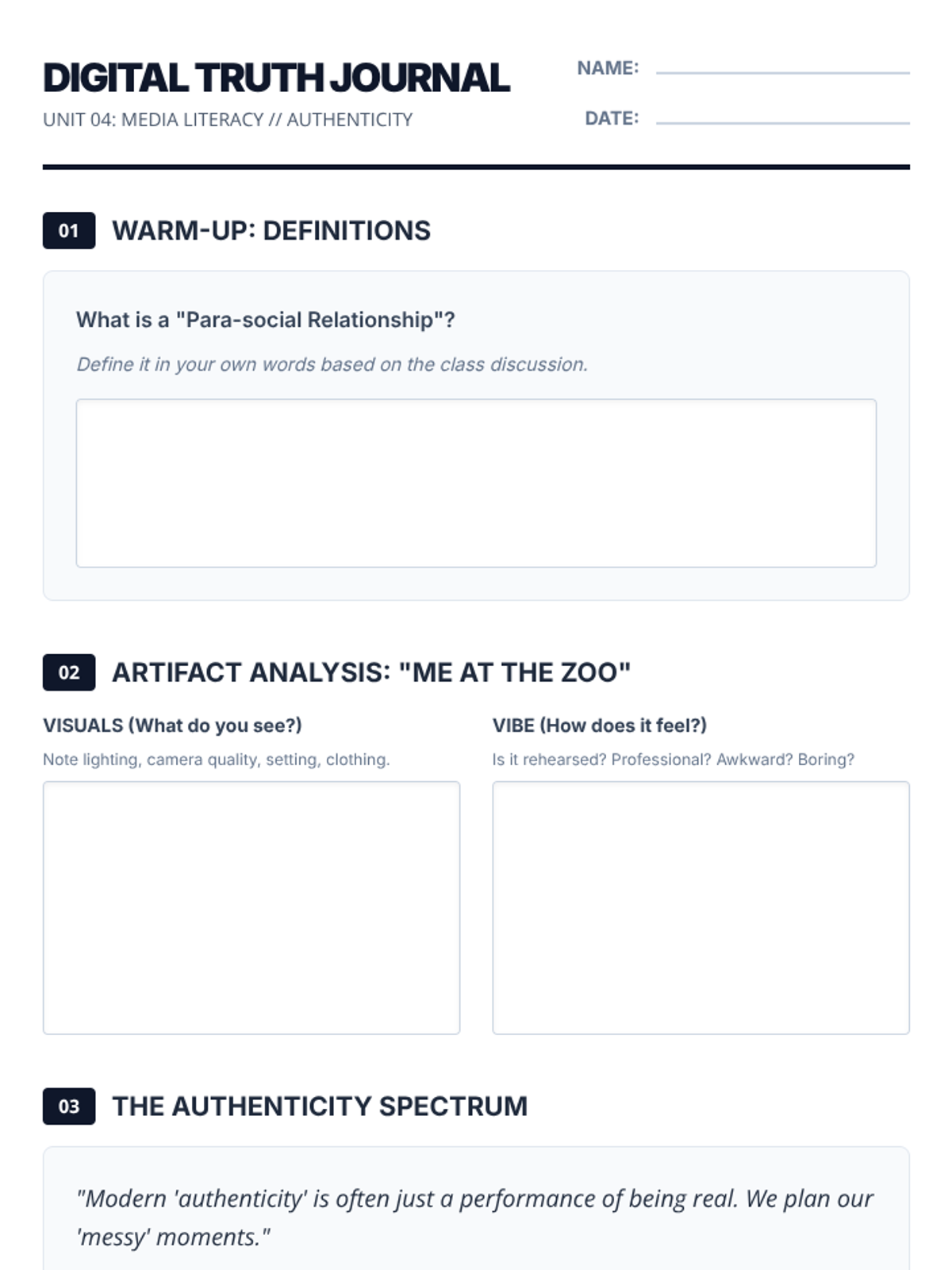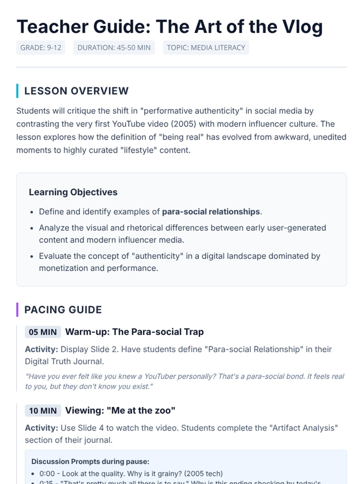 A lesson for High School Media/Journalism students exploring the shift from raw, unedited vlogs to highly curated performative content on social media.