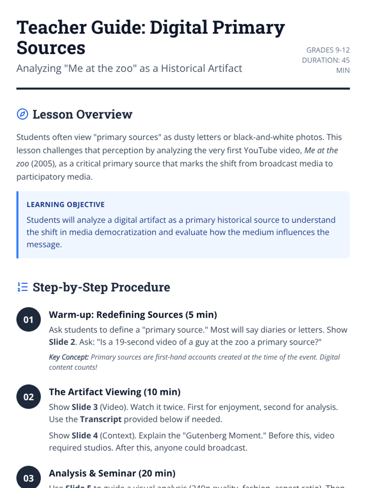 A lesson on analyzing early digital media as primary historical sources, focusing on the first YouTube video 'Me at the zoo'.