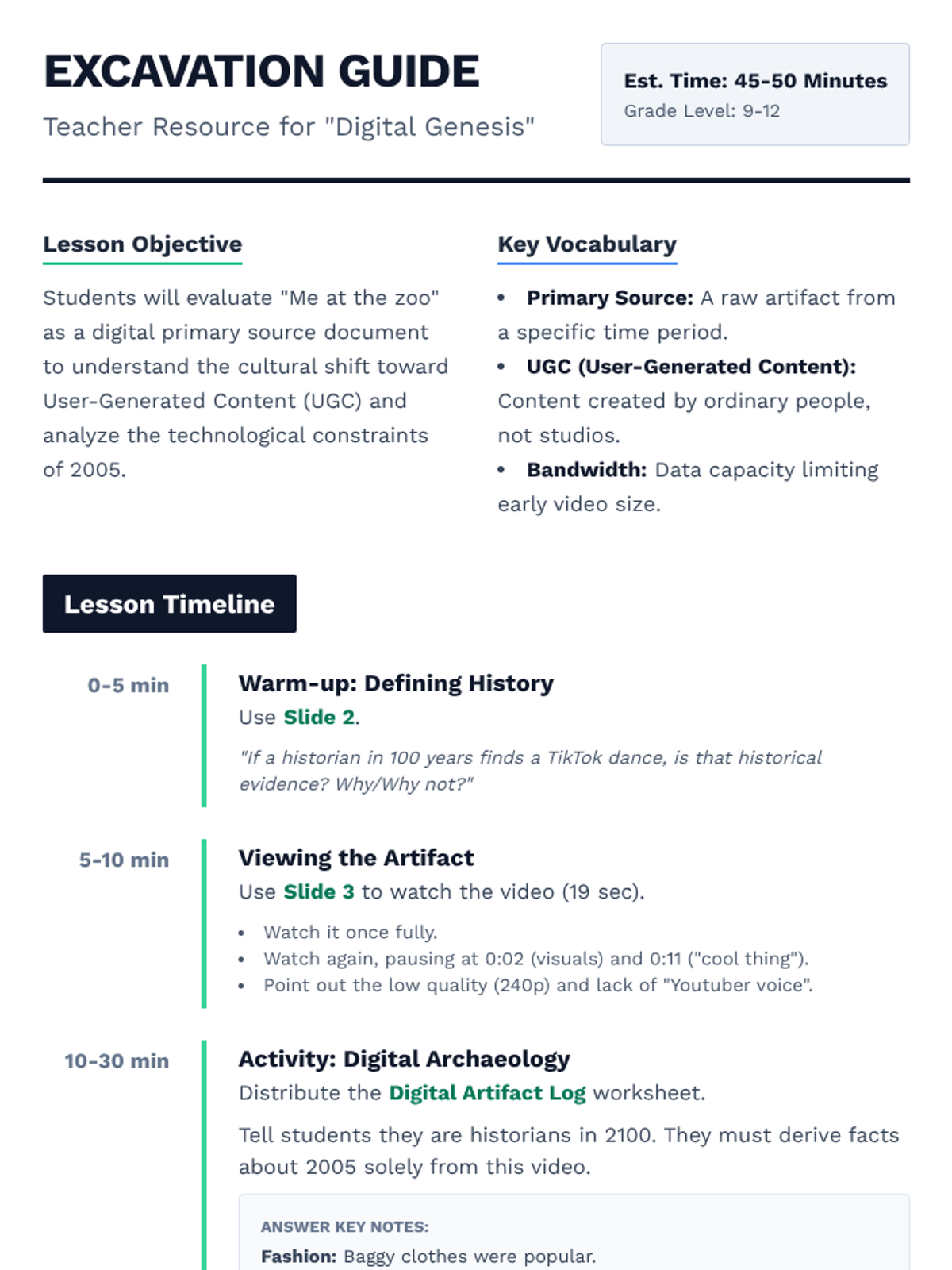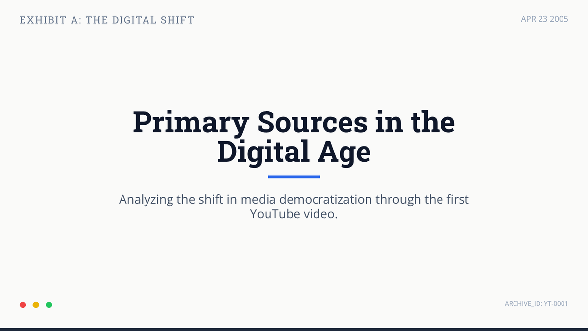 Students analyze the first YouTube video, 'Me at the zoo', as a primary source to understand the shift to User-Generated Content (UGC) and 2005 culture through a digital archaeology simulation.