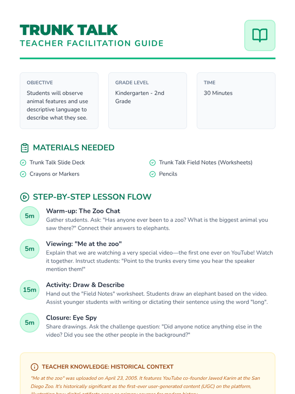 A Kindergarten to 2nd Grade lesson where students practice observation and descriptive language by watching the first-ever YouTube video and drawing an elephant.