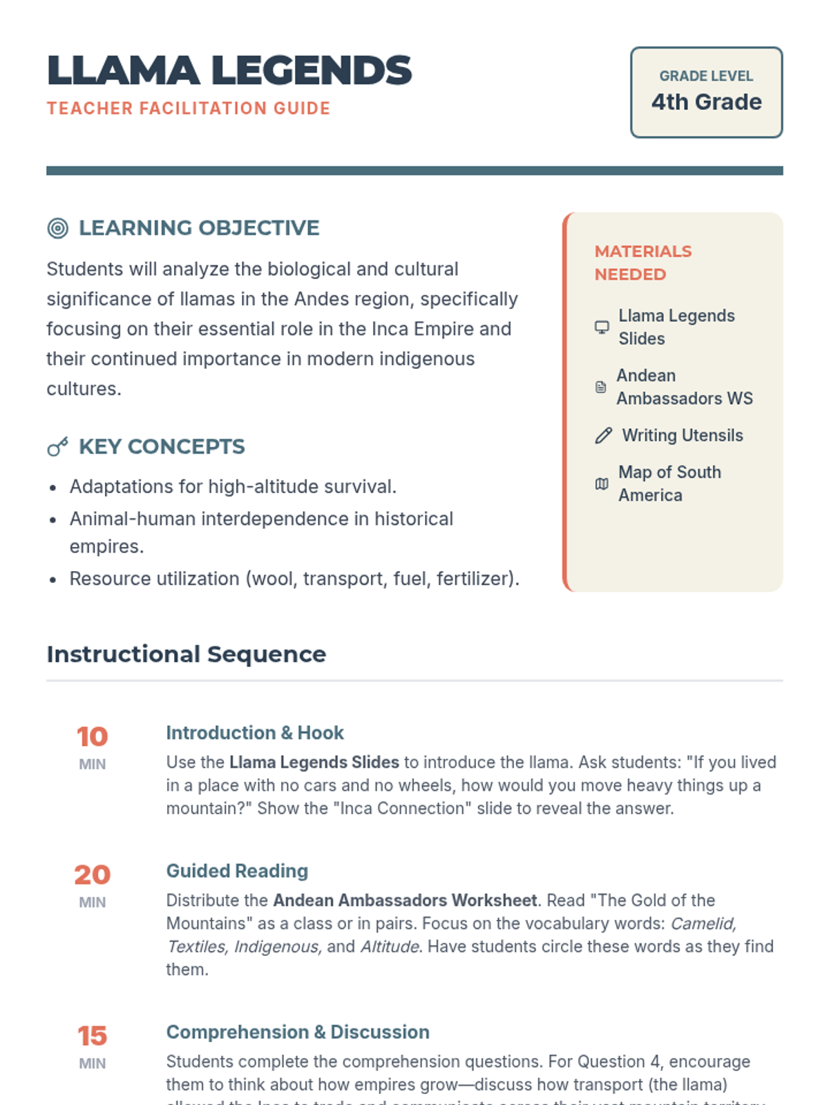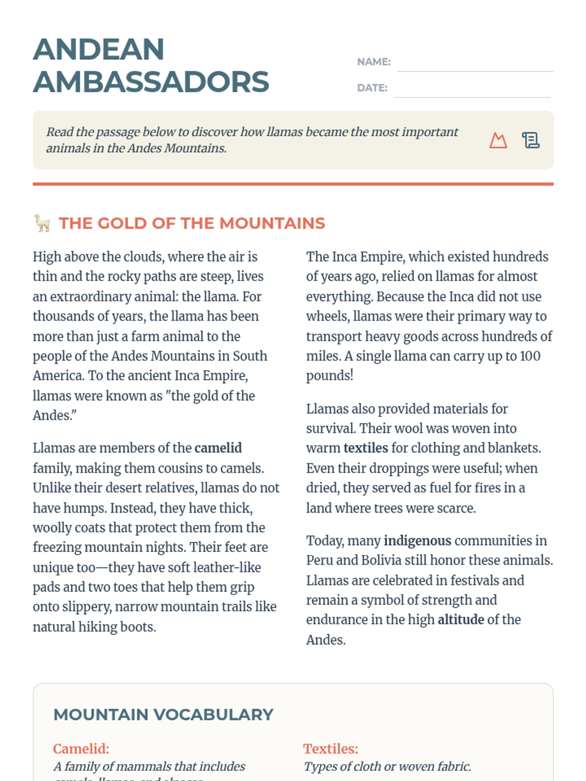 An exploration of llamas as 'the gold of the Andes,' focusing on their biological traits and their deep cultural significance to the Incan people and modern Andean communities. Students will read a passage, learn key vocabulary, and discuss how these animals shaped human history in high-altitude environments.