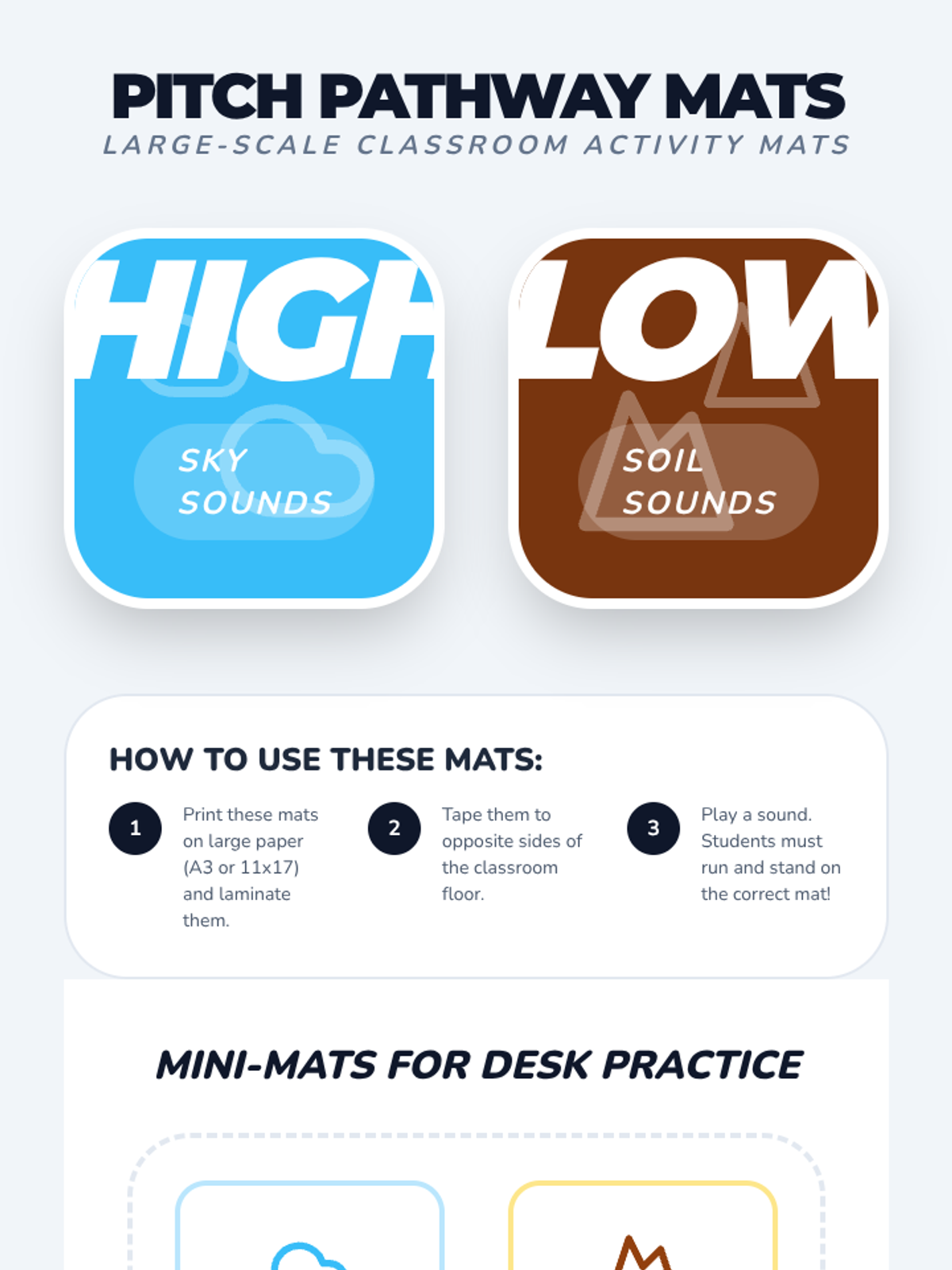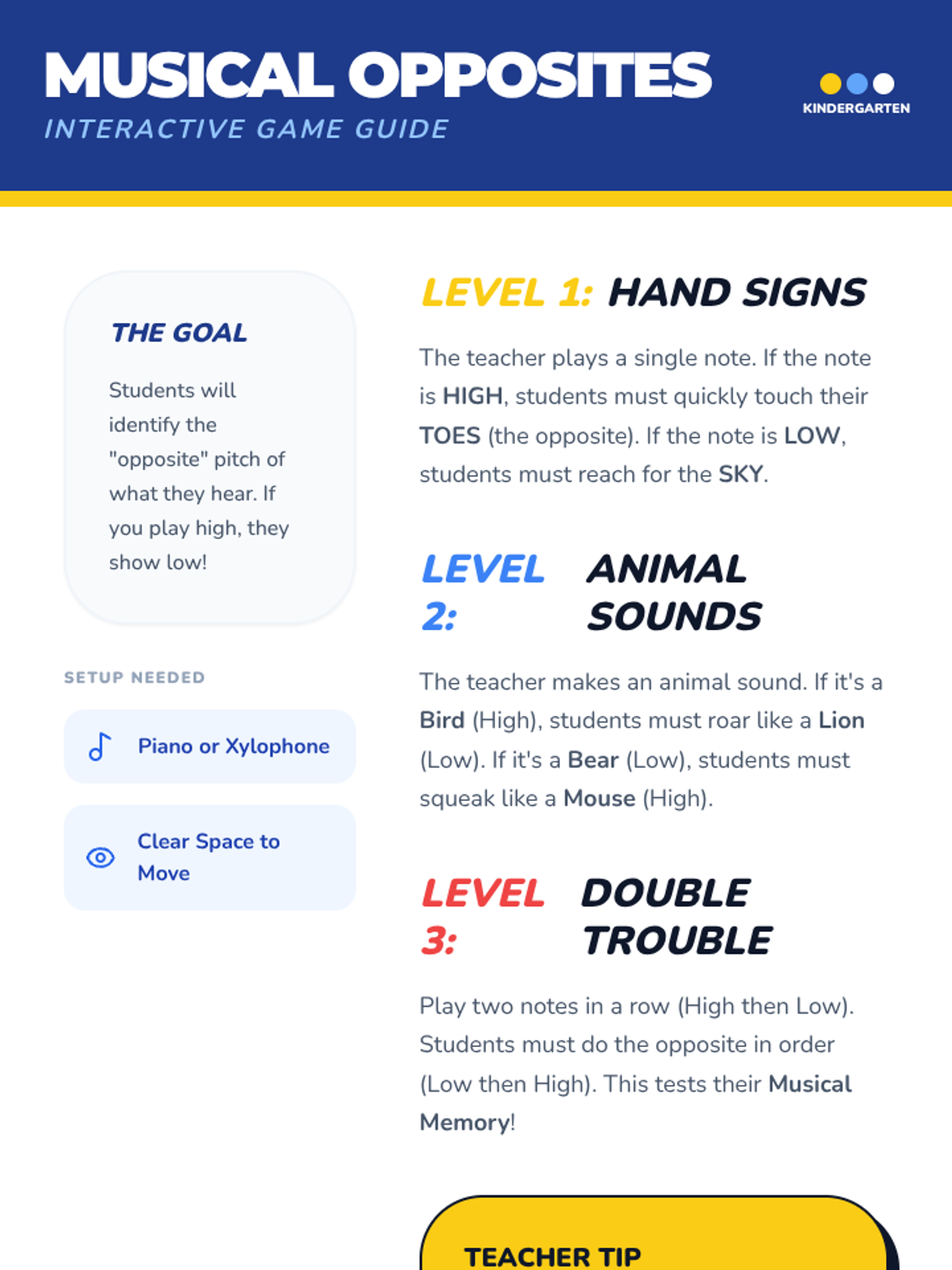 Students will be able to differentiate between high and low sounds (pitch) using their voices and body movements.