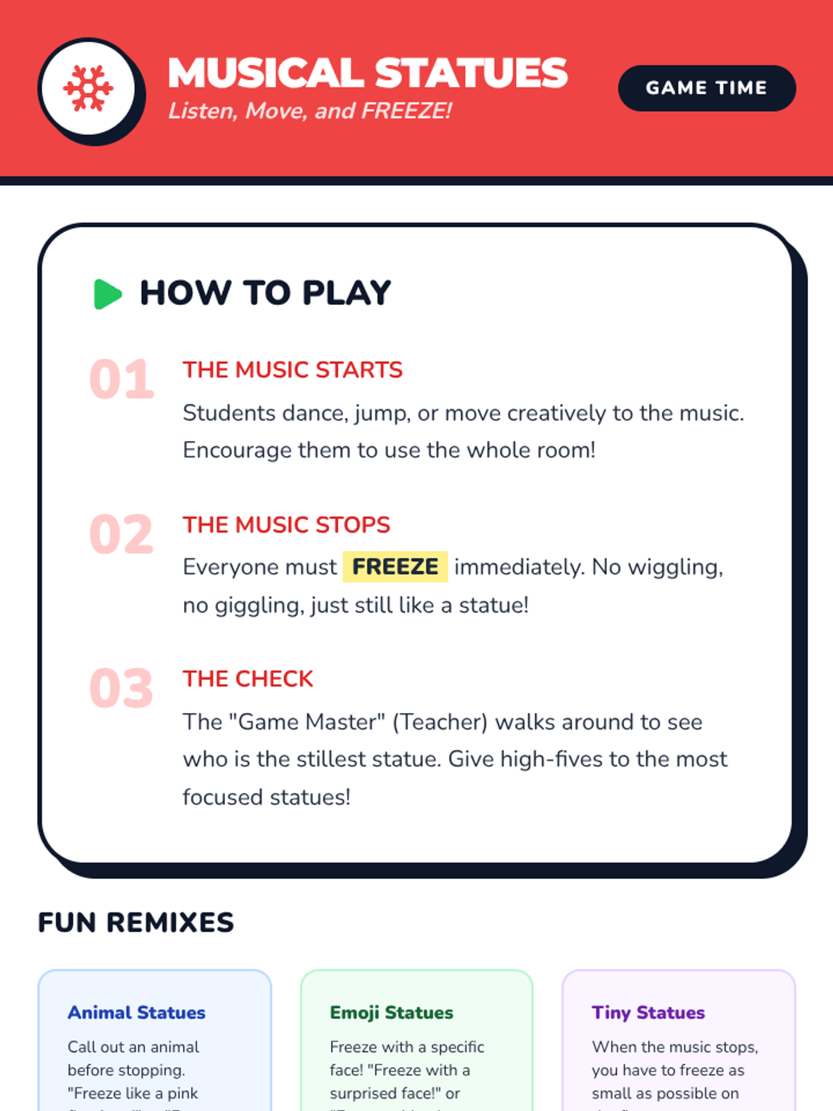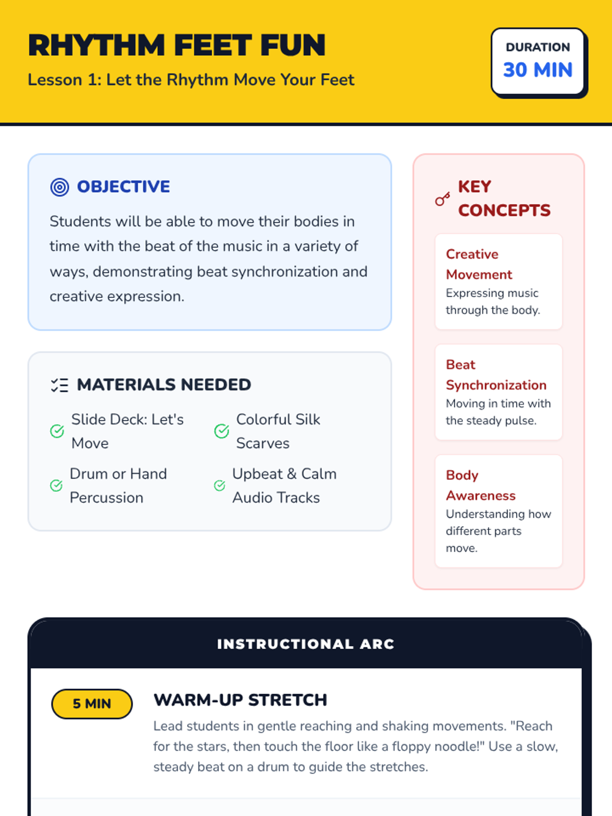 Students will be able to move their bodies in time with the beat of the music in a variety of ways, exploring body awareness and synchronization.