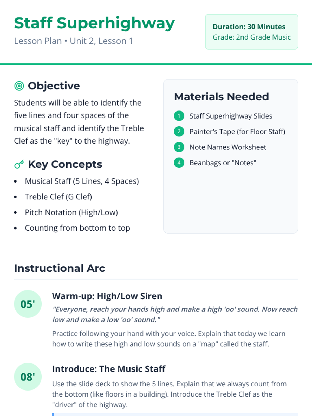 Students will be able to identify the five lines and four spaces of the musical staff and understand the role of the treble clef.