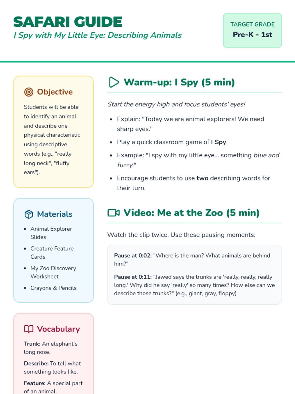 A fun, introductory lesson for early learners to practice descriptive language through the lens of animals, inspired by the first-ever YouTube video. Students identify animal features and use a simple sentence frame to share their observations.