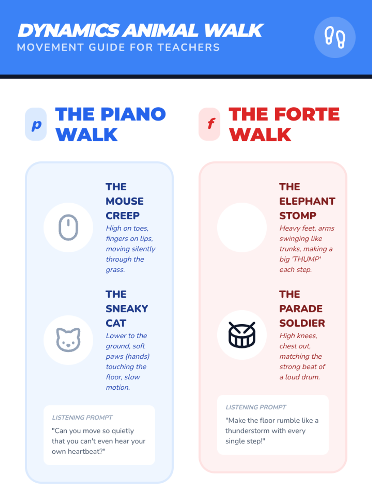 Students will be able to identify and demonstrate loud and soft sounds (dynamics) through voice, movement, and instruments.