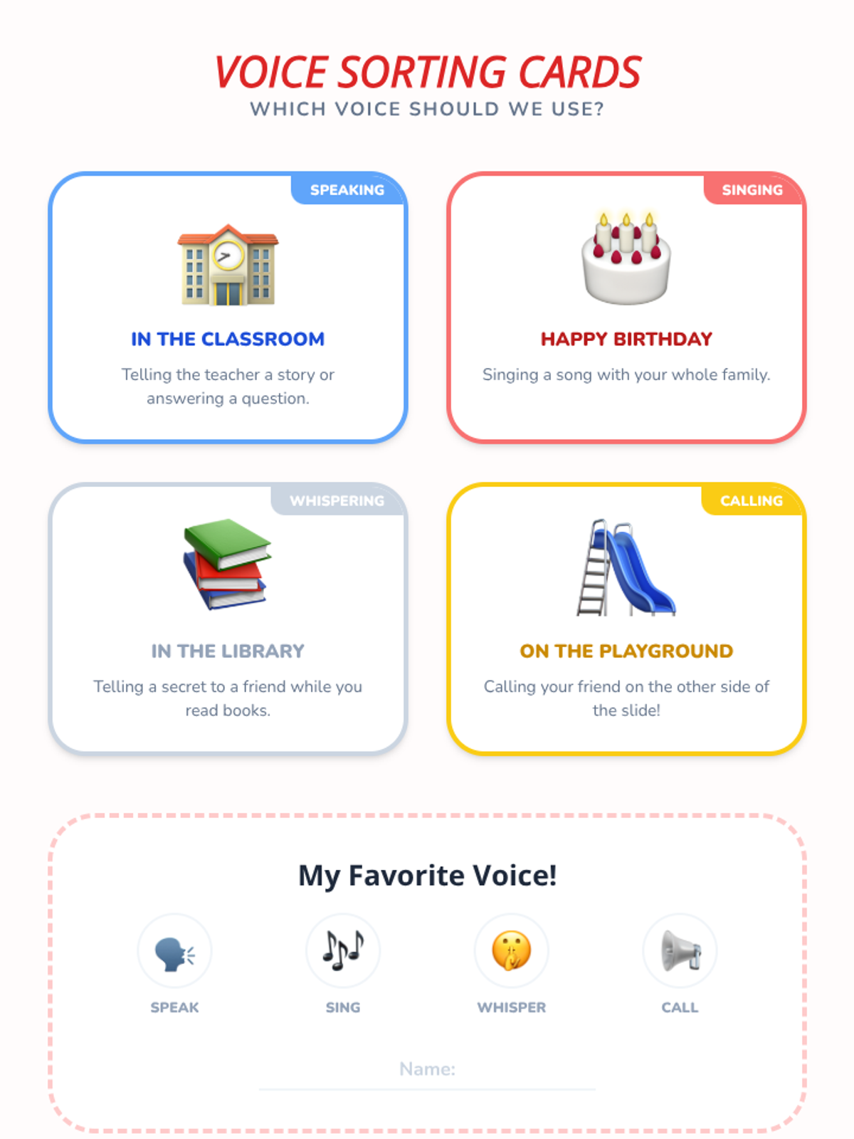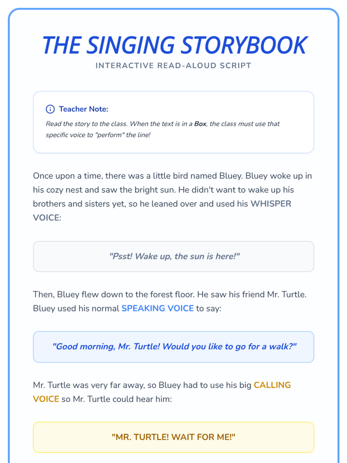 Students will be able to identify and demonstrate the difference between their singing and speaking voices.