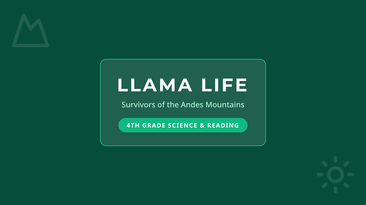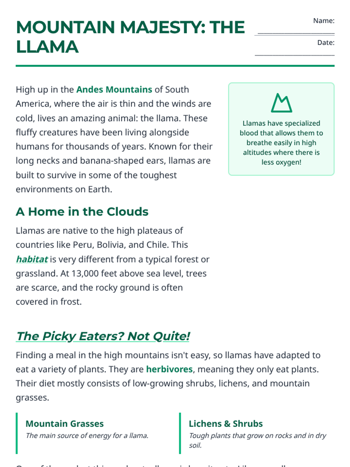 A comprehensive lesson for 4th graders on llamas, covering their habitat in the Andes and their unique diet. Includes a reading passage, comprehension worksheet, and an answer key.