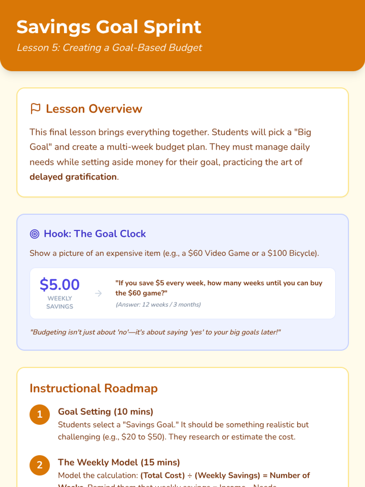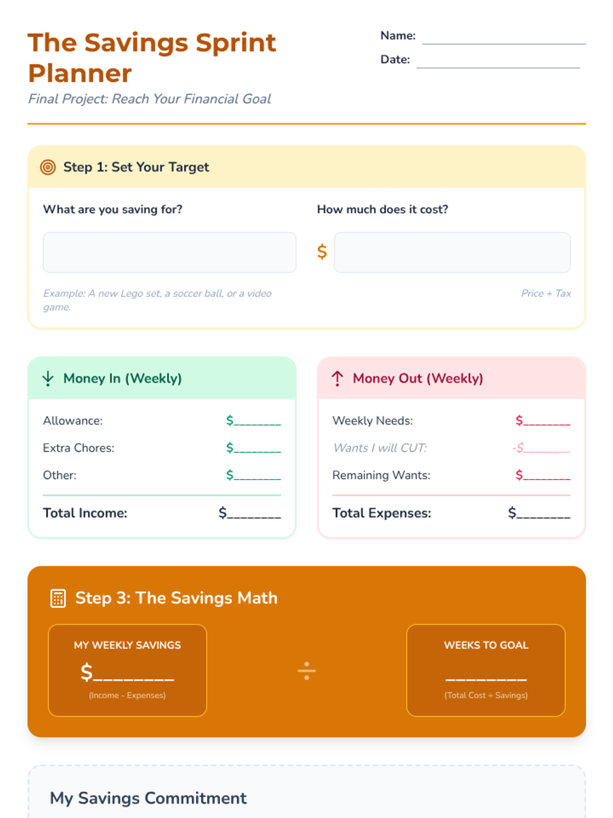 A culminating project where students create a budget to reach a specific savings goal while managing weekly expenses.
