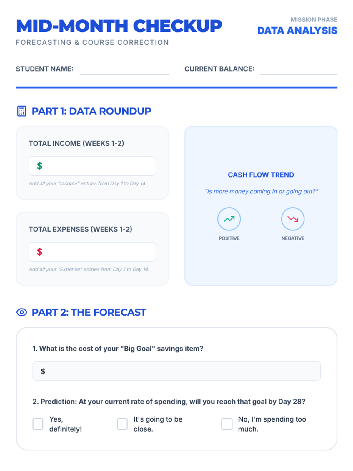 Mid-month data analysis. Students review their spending trends and forecast their future balance to ensure they stay on track for their big savings goal.