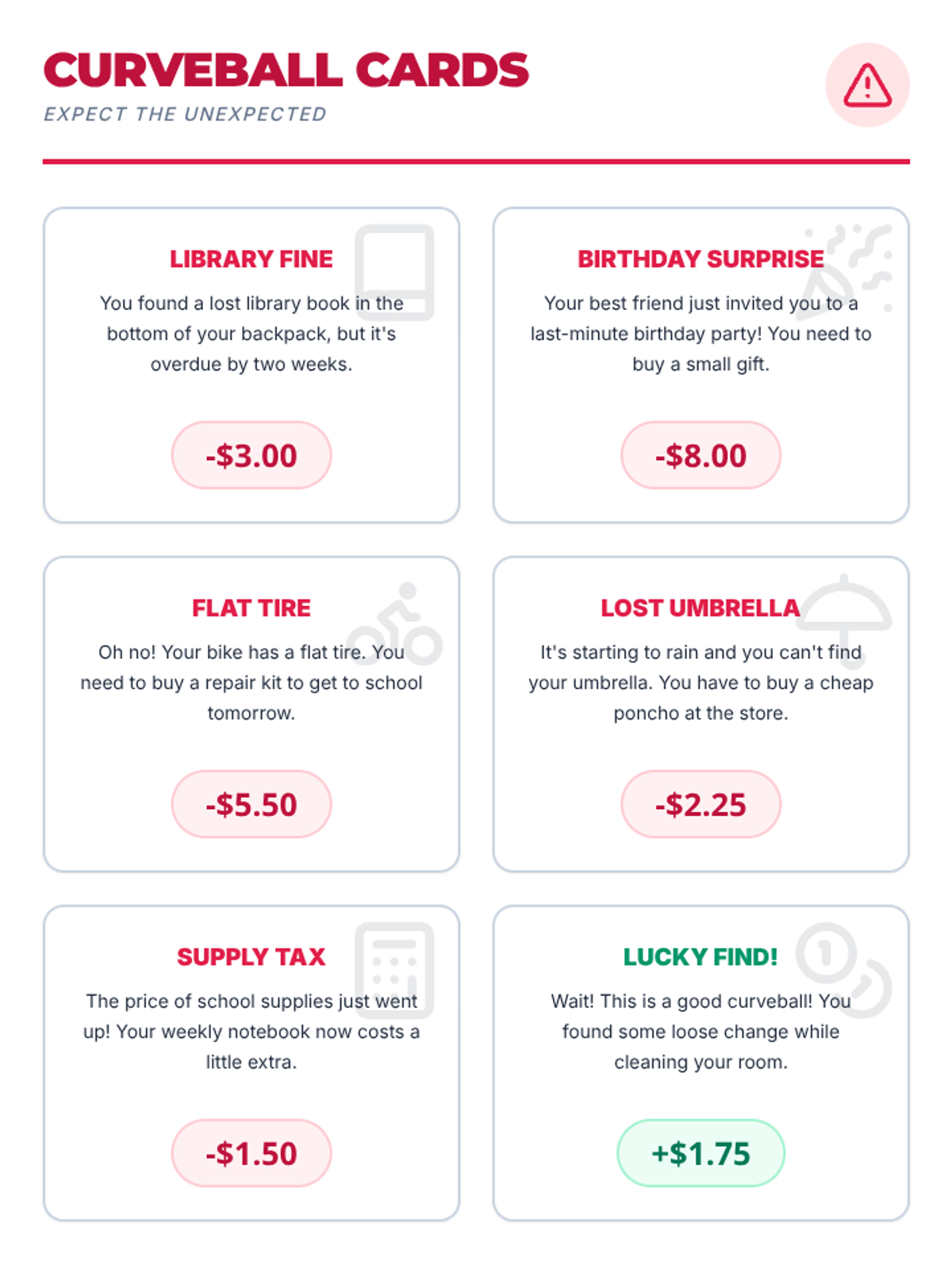 Navigating financial curveballs. Students adjust their budgets to account for unexpected costs like library fines or gifts while maintaining their savings goals.