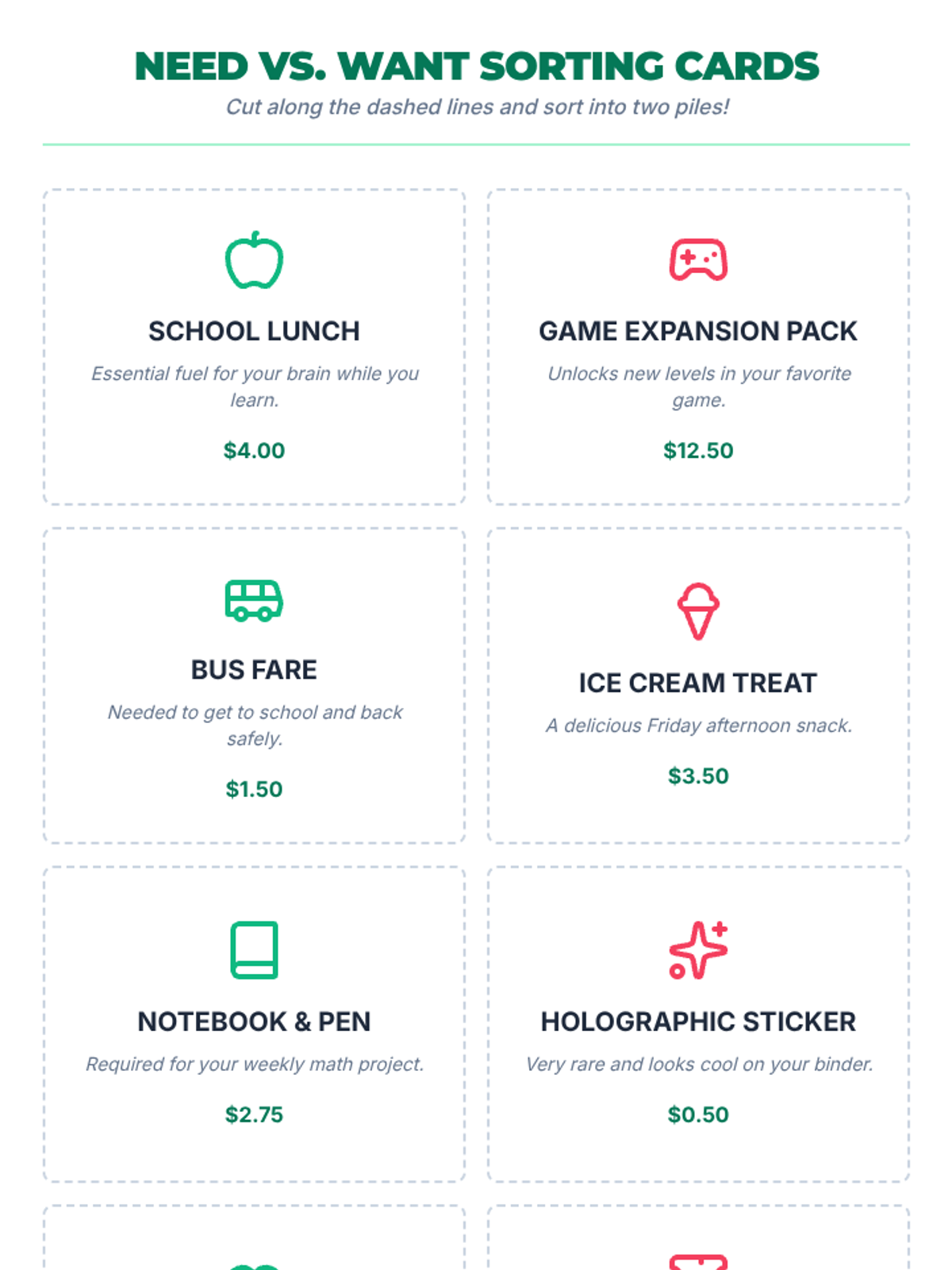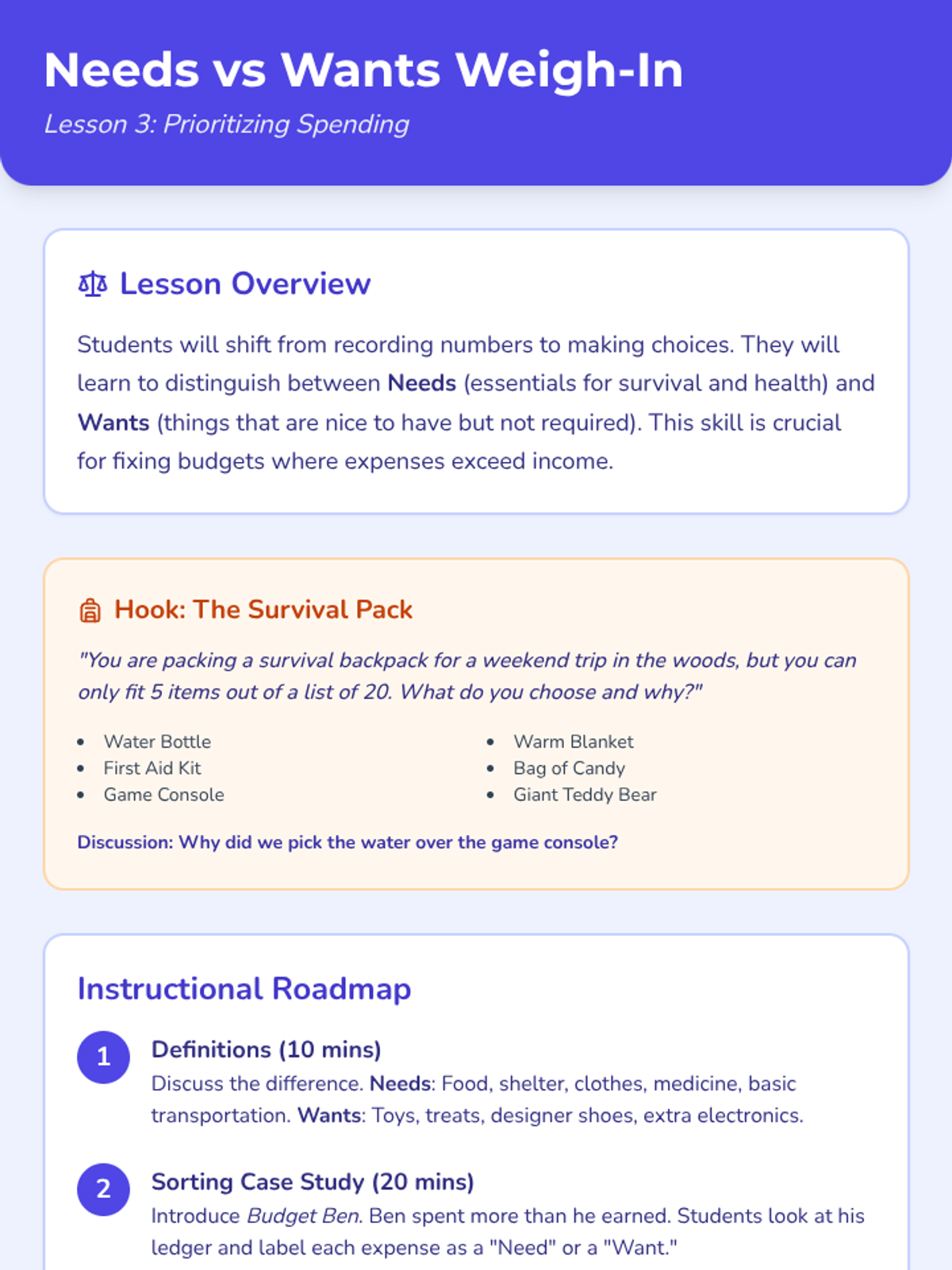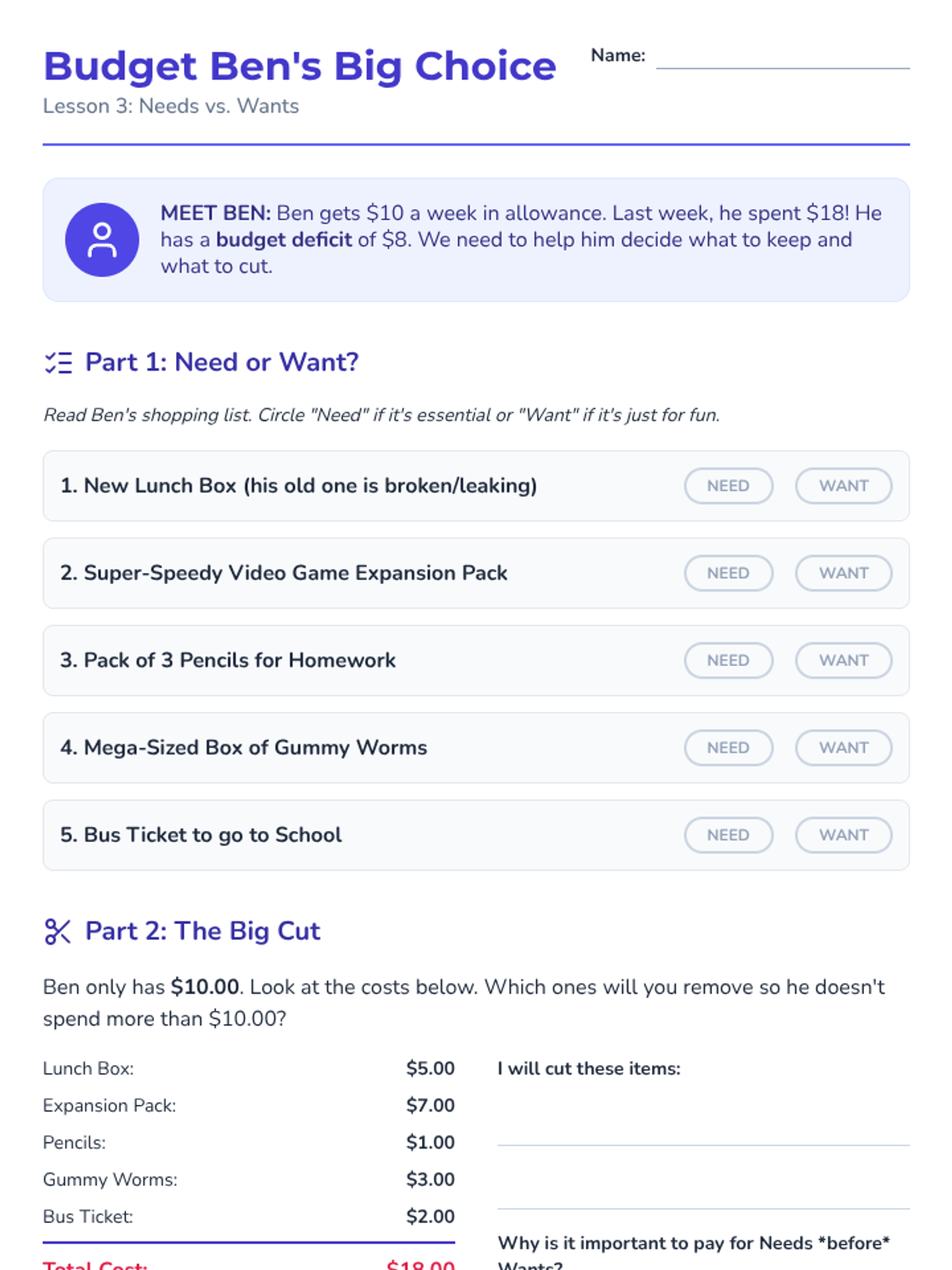 Focuses on financial decision-making by distinguishing essential needs from discretionary wants to fix a deficit.