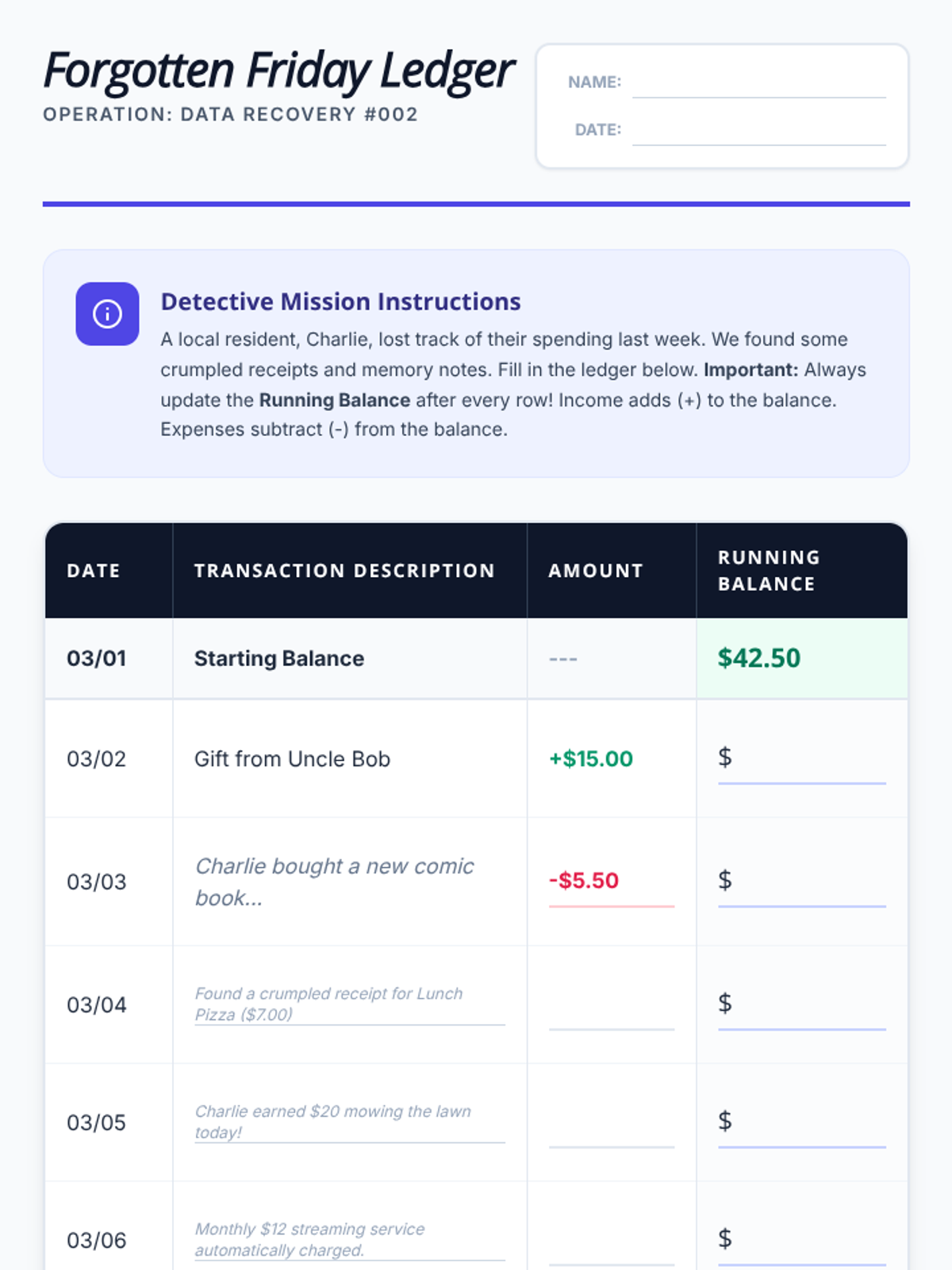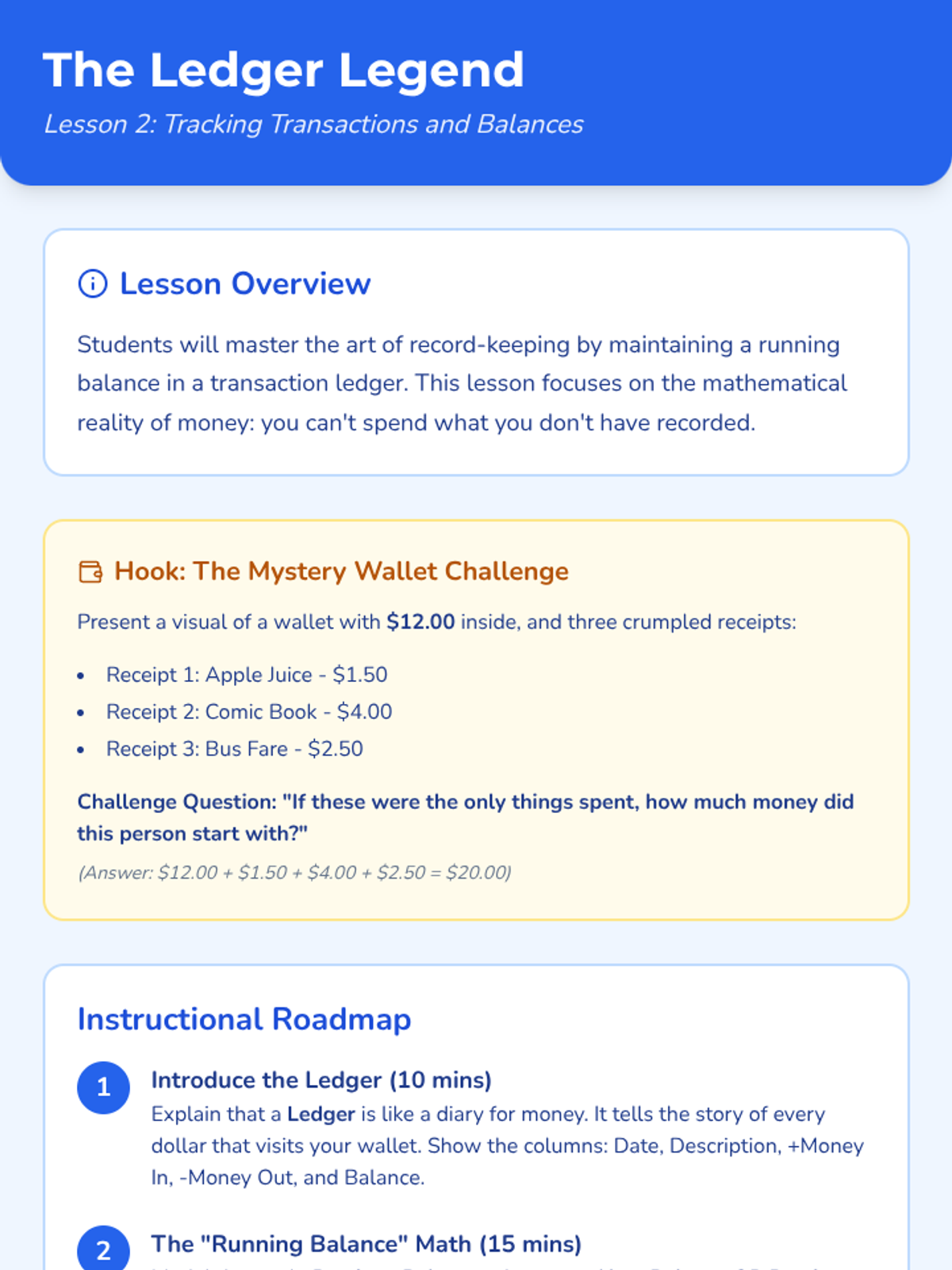 Teaches students how to record transactions and maintain a running balance using a simple ledger.