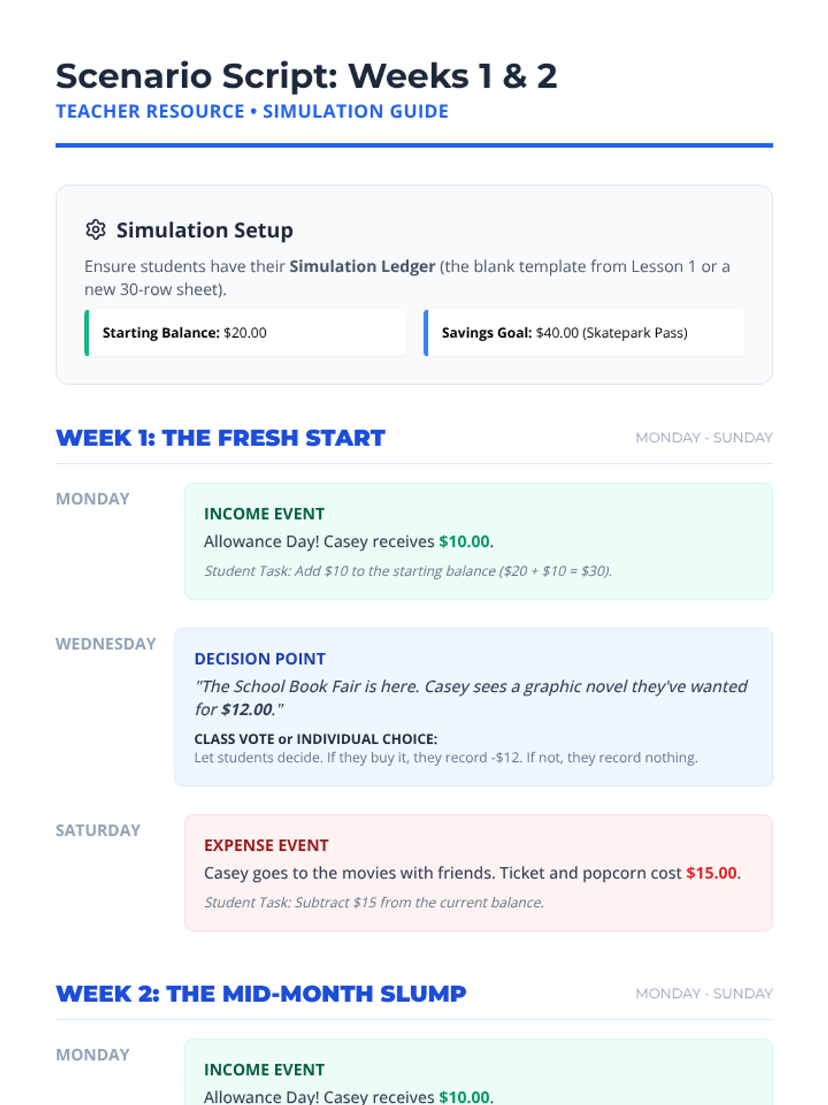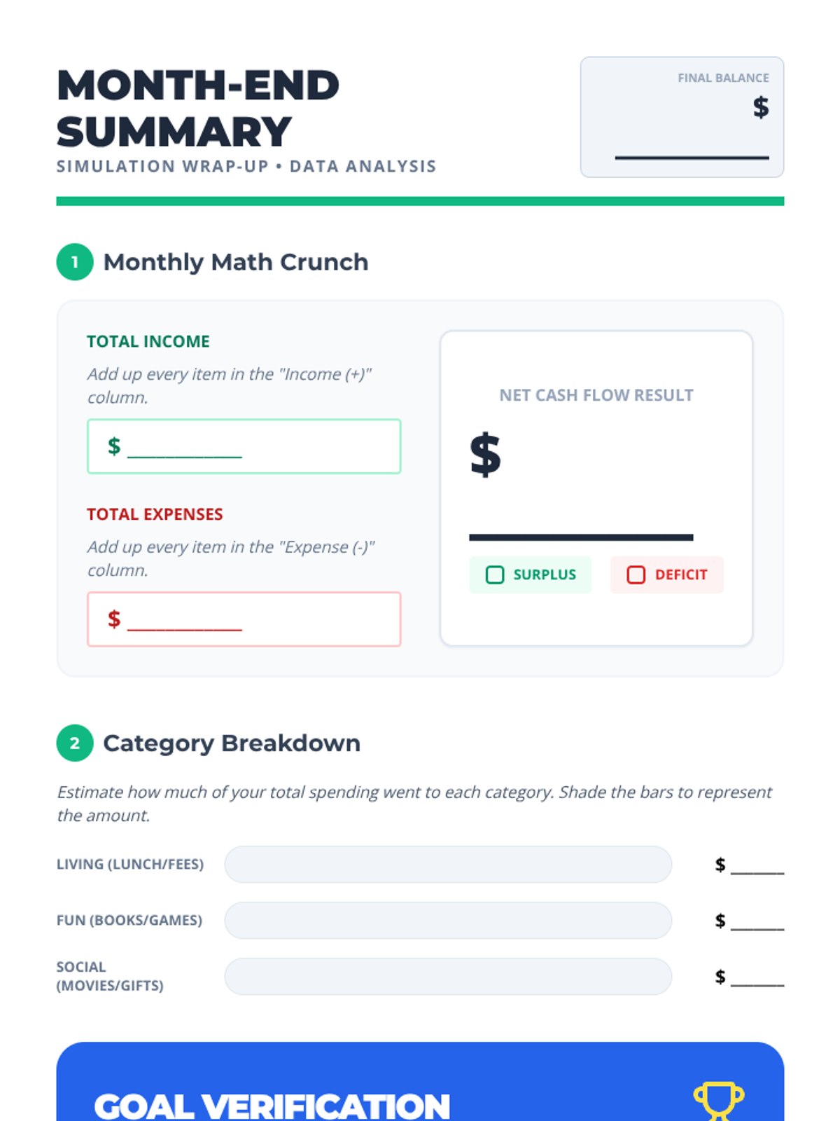 Final financial reflection. Students balance their ledgers, evaluate their spending choices, and celebrate their savings successes or identify areas for improvement.